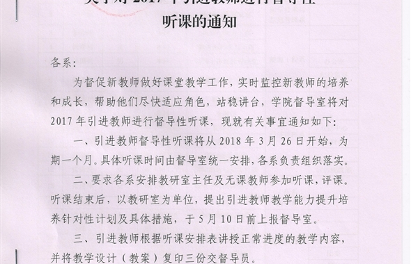 關(guān)于對2017年引進教師進行督導(dǎo)性聽課的通知