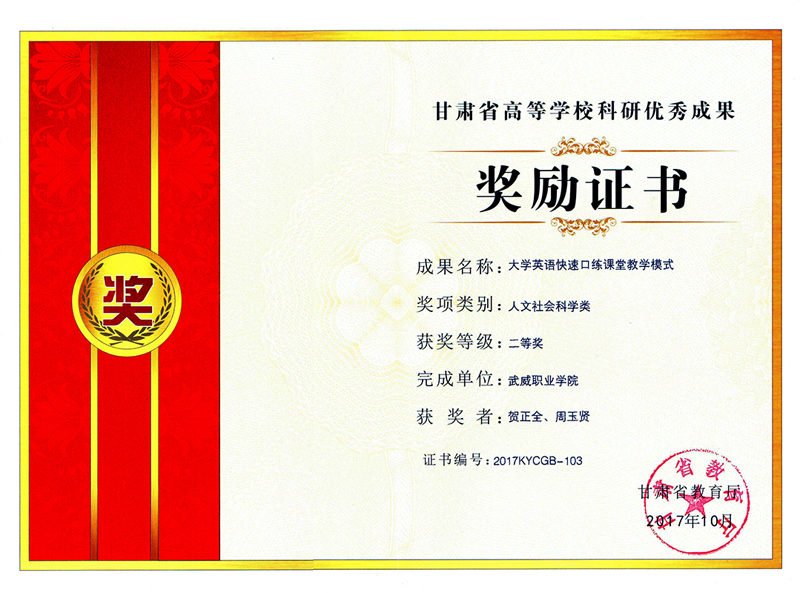 近日從學院科研處傳來喜訊,我系教師賀正全申報的《大學英語快速口練課堂教學模式》榮獲甘肅省教育廳頒發(fā)的2017年甘肅省高等學??蒲袃?yōu)秀成果二等獎。這是我院自建院以來獲得的最高級別的高??蒲袃?yōu)秀成果獎。本次獲得二等獎的科研成果共有154項,其中高職高專報送的科研成果只有9項獲得二等獎。