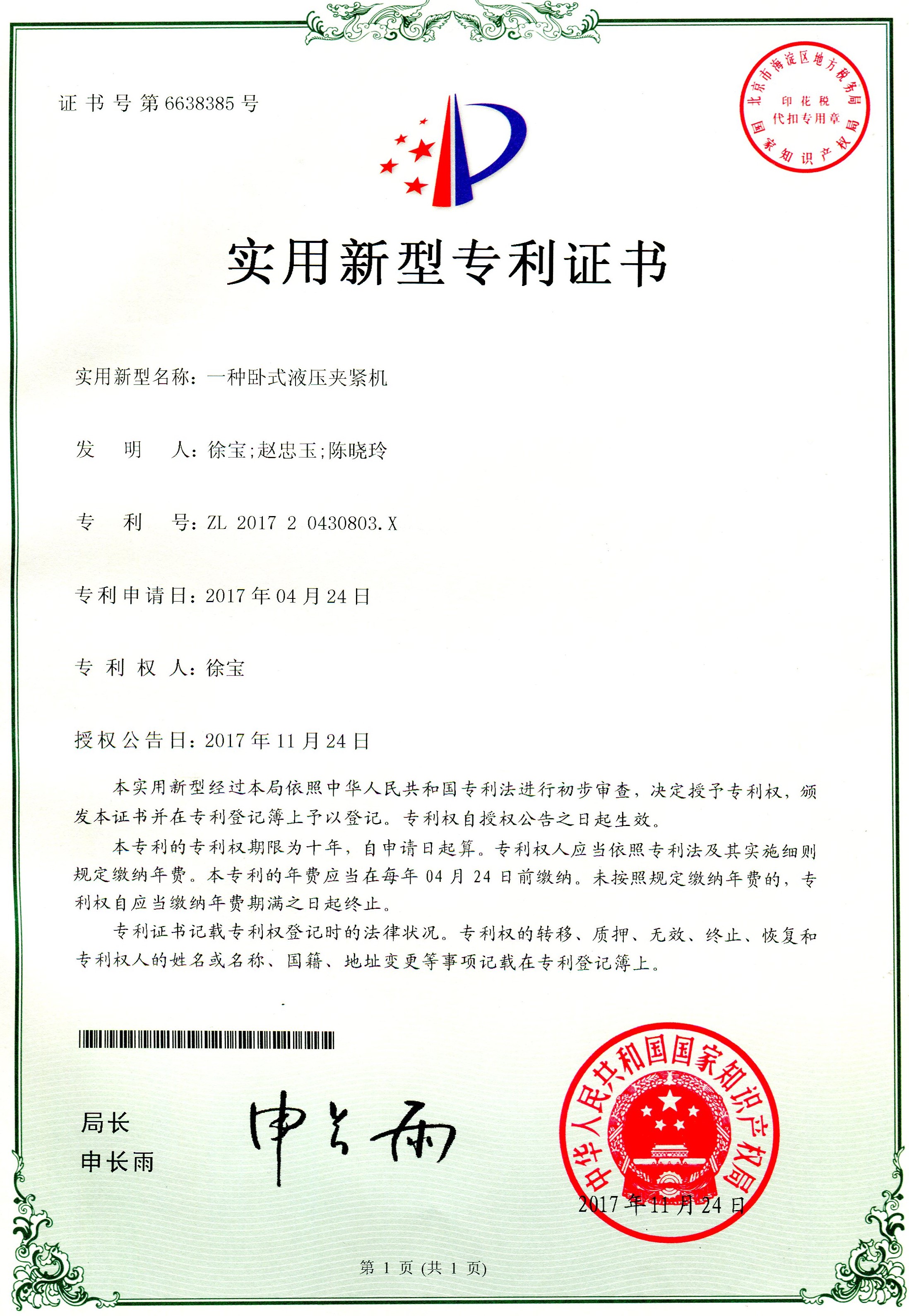 科研成果---實(shí)用新型專利:一種臥式液壓夾緊機(jī)