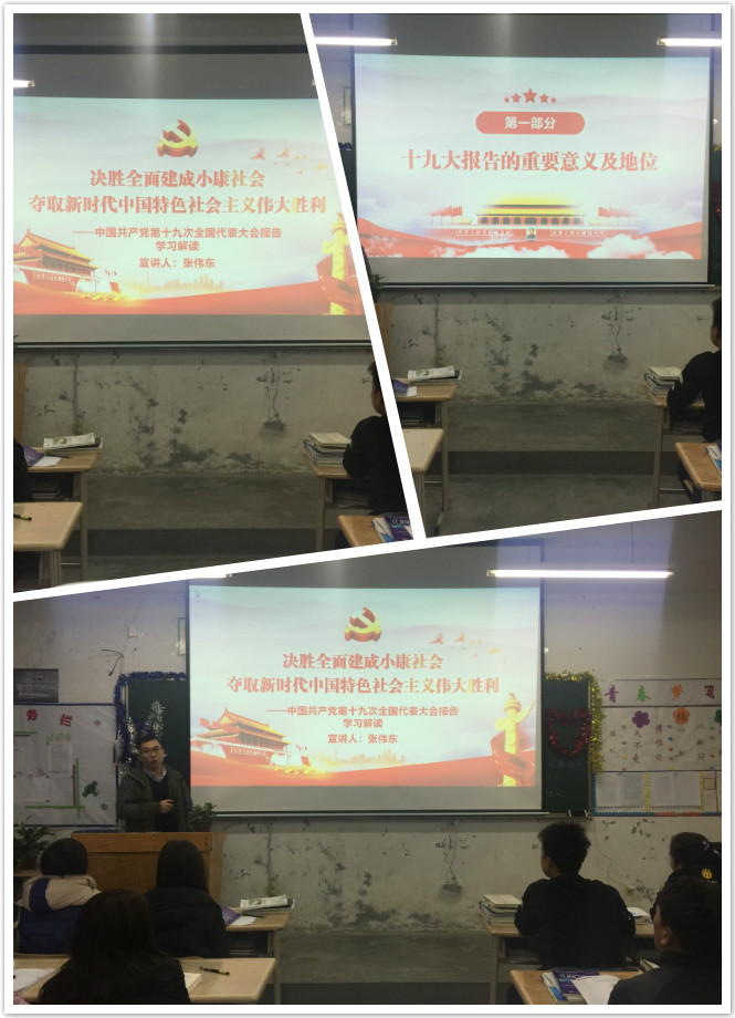 12月20日晚自習(xí)時(shí)間,在17級(jí)計(jì)算機(jī)網(wǎng)絡(luò)大專班教室,電信系黨員教師張偉東同志給學(xué)生們以《深入學(xué)習(xí)重點(diǎn)解讀十九屆大會(huì)議報(bào)告精神》為主題,對(duì)十九大報(bào)告進(jìn)行了全方位的宣講解讀。