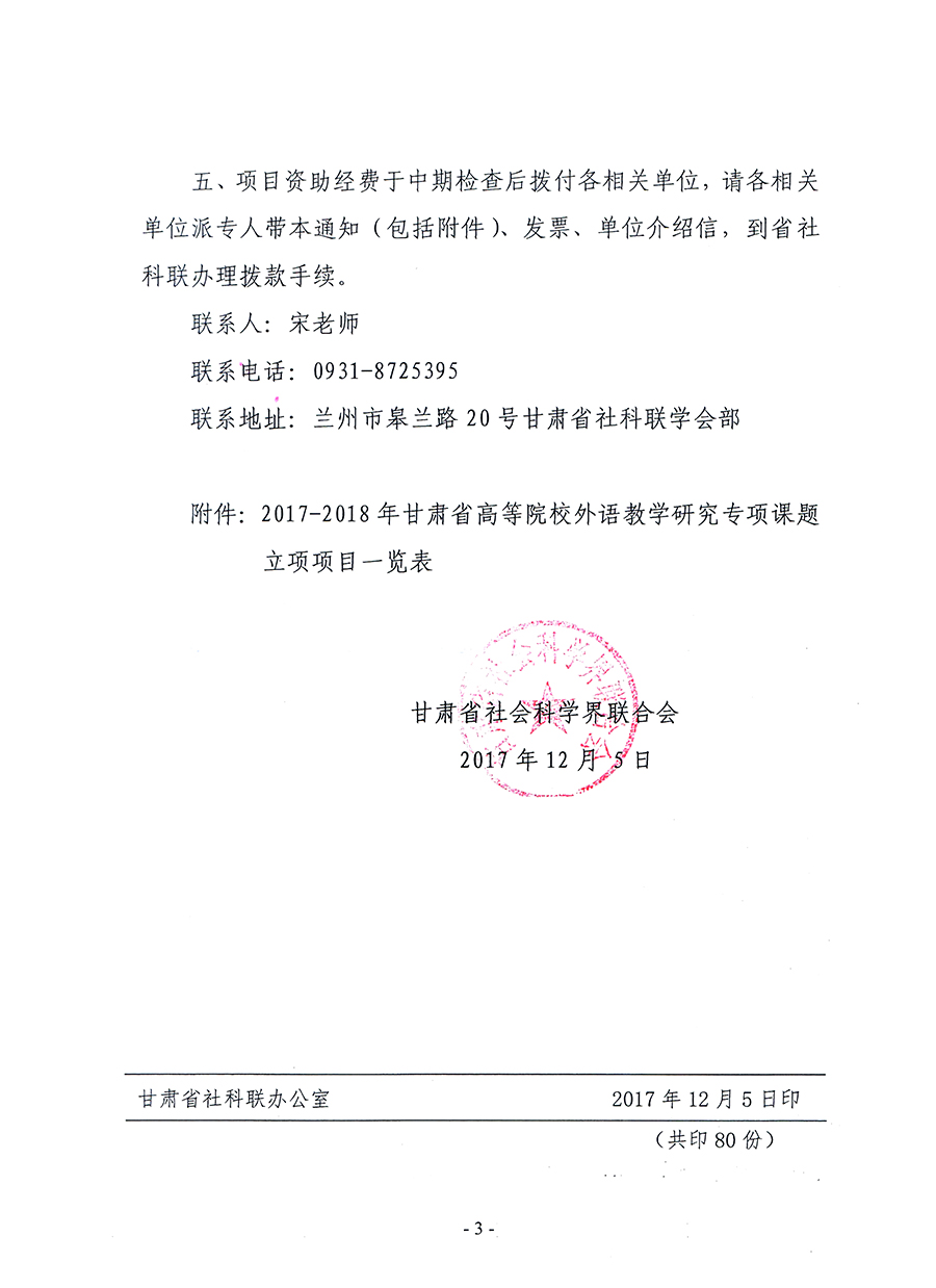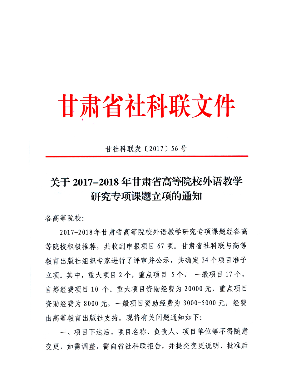 轉(zhuǎn)發(fā)甘肅省社科聯(lián)“關(guān)于2017-2018年甘肅省高等院校外語教學研究專項課題立項的通知”