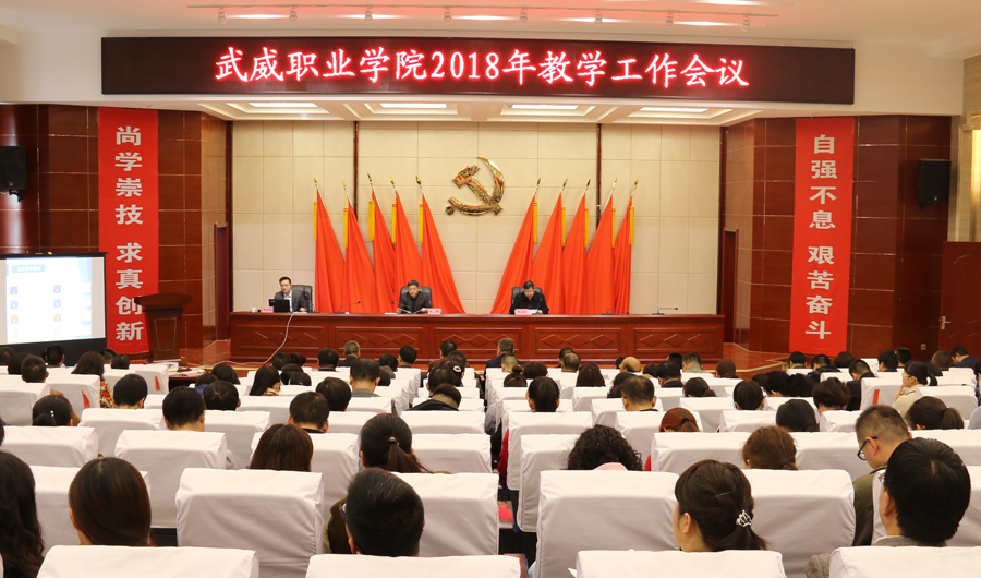 黨委副書記趙明對學(xué)院2017年教學(xué)工作做了簡要回顧與總結(jié),結(jié)合全國全省教育工作會議精神,深入分析了學(xué)院目前面臨的困難與存在的問題,從八個方面對2018年學(xué)院教學(xué)重點工作做了安排部署。一是加強思想政治建設(shè),貫徹落實中央決策部署。學(xué)習(xí)貫徹習(xí)近平新時代中國特色社會主義思想和黨的十九大精神,貫徹落實全國教育大會精神,細化落實職業(yè)教育具體工作措施。二是深化改革,增強辦學(xué)活力。堅持依法治校,繼續(xù)完善內(nèi)部治理體系,加強學(xué)術(shù)委員會、職稱評審委員會建設(shè),健全管理體系和運行機制,大力推進人才培養(yǎng)模式改革和招生考試制度改革。三是強化內(nèi)涵,全力推進優(yōu)質(zhì)高職院校建設(shè)。抓實推進優(yōu)質(zhì)高職院校6個模塊19個項目94項任務(wù)312條子任務(wù)的建設(shè)工作,加強內(nèi)部協(xié)調(diào),全力推進。加強專業(yè)內(nèi)涵建設(shè)和實踐教學(xué)內(nèi)涵建設(shè),建立一批優(yōu)質(zhì)特色專業(yè)和一批高水平生產(chǎn)性實訓(xùn)基地;積極開展創(chuàng)新創(chuàng)業(yè)教育實踐活動,加大社會培訓(xùn)力度,積極探索開展國際合作與交流;加強智慧校園和校園文化建設(shè)。四是優(yōu)化結(jié)構(gòu),全力打造一批高水平優(yōu)質(zhì)特色專業(yè)。利用直屬附屬醫(yī)院、校辦企業(yè)武威泰豐新能源有限責(zé)任、甘肅(武威)國際陸港和武威保稅物流中心等優(yōu)勢,加快重點專業(yè)建設(shè)力度,打造3~5個國家級高水平優(yōu)質(zhì)特色專業(yè)。五是合作培養(yǎng),著力打造專兼結(jié)合的高水平教師隊伍。大力實施教師素質(zhì)提升工程,完善同濟大學(xué)編制的《武威職業(yè)學(xué)院師資能力提升培訓(xùn)方案》,落實西安交通大學(xué)、天津職業(yè)大學(xué)簽訂的合作協(xié)議,推進教師教學(xué)發(fā)展中心建設(shè)與運行,強化專業(yè)帶頭人、新進教師、骨干教師、優(yōu)秀青年教師的培養(yǎng)力度。六是育人為本,關(guān)注學(xué)生成長成才。優(yōu)化育人環(huán)境,開足開好思想政治類、人文素養(yǎng)提升類課程,開展校內(nèi)職業(yè)技能競賽,鼓勵支持參加省級以上比賽,培養(yǎng)學(xué)生能力。七是深化產(chǎn)教融合,提升社會服務(wù)水平。充分發(fā)揮職業(yè)教育集團作用,深化“職業(yè)教育+產(chǎn)業(yè)園區(qū)+生產(chǎn)基地”的校企合作模式;提升校辦企業(yè)、直屬附屬醫(yī)院的教學(xué)服務(wù)功能;各專業(yè)要拓展產(chǎn)教融合渠道,精準(zhǔn)施策,服務(wù)國家戰(zhàn)略。八是完善質(zhì)量保障機制,提升人才培養(yǎng)質(zhì)量。編制并逐步推行教學(xué)工作診斷與改進方案,學(xué)習(xí)實施精細化管理模式,加大教學(xué)督查力度,規(guī)范教學(xué)秩序,提高教育教學(xué)管理水平。