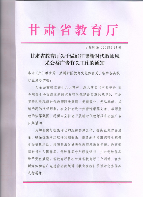 ???? 現(xiàn)將甘肅省教育廳《甘肅省教育廳關(guān)于做好征集新時(shí)代教師風(fēng)采公益廣告有關(guān)工作的通知》(甘教師函〔2018〕24號(hào))轉(zhuǎn)發(fā)你們,請各部門、單位根據(jù)通知要求認(rèn)真組織,積極參與。將參賽作品于5月15日前報(bào)宣傳統(tǒng)戰(zhàn)部辦公室,宣傳統(tǒng)戰(zhàn)部對報(bào)送作品匯總后統(tǒng)一報(bào)送省教育廳電教中心。