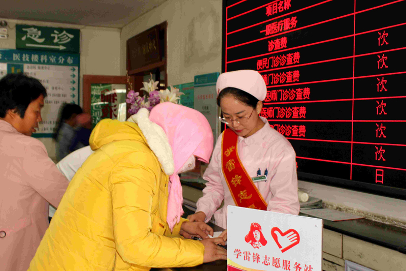 學(xué)雷鋒志愿服務(wù)站工作人員主要由年輕護(hù)士們擔(dān)任。她們身著護(hù)士裝,佩戴印有“學(xué)雷鋒志愿者服務(wù)”字樣綬帶,主動為患者服務(wù)。志愿者們提供的主要服務(wù)項目有:在門診為老、弱、病、殘、孕等患者提供輪椅擔(dān)架租借。為患者提供開水、就醫(yī)導(dǎo)診、戒煙勸導(dǎo)、醫(yī)學(xué)人文關(guān)懷、慢性病知識普及和健康宣教等便民利民服務(wù),受到了患者及家屬的一致好評。