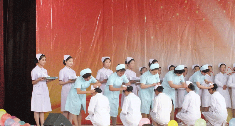在慶?;顒又校?015級畢業(yè)生代表進行“心肺復蘇技術(shù)”及“右踝關(guān)節(jié)扭傷包扎技術(shù)”表演, 舉行了文藝演出,向全體觀眾展示了護理系學生的精神風貌與才藝。