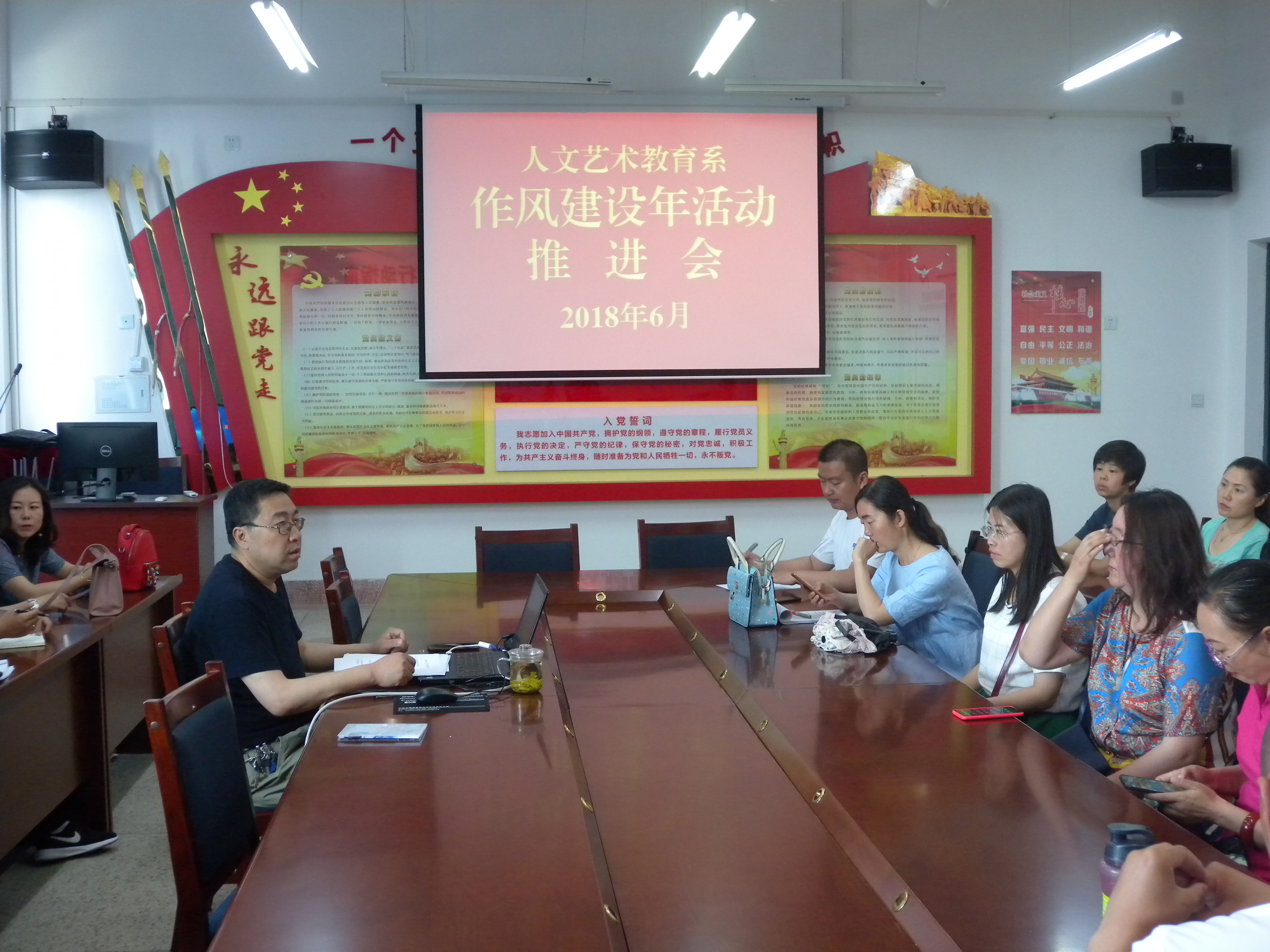 人文藝術(shù)教育系于6月13日召開了人文藝術(shù)教育系“作風(fēng)建設(shè)年”活動推進會。會議由系黨總支書記胡靜峰同志主持,全體教職工參加了會議。