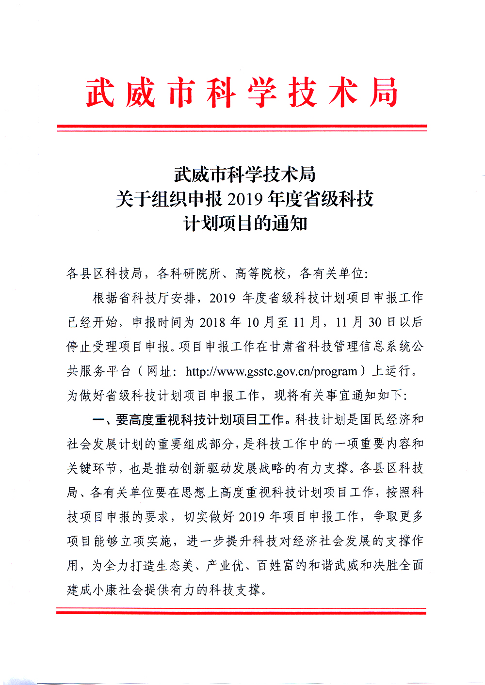 轉(zhuǎn)發(fā)武威市科學(xué)技術(shù)局關(guān)于組織申報2019年度省級科技計劃項目的通知