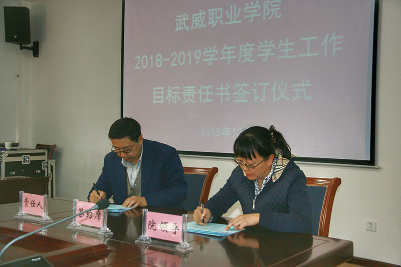 責(zé)任書簽訂儀式上,田迎春代表學(xué)院與各系黨總支書記或負責(zé)人簽訂了《武威職業(yè)學(xué)院2018-2019學(xué)年度學(xué)生工作目標(biāo)責(zé)任書》。她充分肯定了各系2017-2018學(xué)年的學(xué)生工作,并就我院學(xué)生工作提出了具體要求,一是學(xué)生工作要緊緊圍繞“立德樹人”的根本任務(wù),樹立全院全員育人思想,各系要強化學(xué)生工作管理責(zé)任,增強工作主動性和責(zé)任性,使學(xué)生管理的各項工作更細、更實;二是各系要在學(xué)生思想政治教育和日常管理工作中堅持誰主管誰負責(zé)的原則,力求做到“工作規(guī)范化、管理精細化、服務(wù)人性化”;三是各系及學(xué)工部門在思想上要與學(xué)院保持高度一致,在工作落實上與學(xué)院保持相向而行,切實將目標(biāo)責(zé)任書的承諾轉(zhuǎn)化為抓工作、謀發(fā)展、促改革的具體行動;四是要在就業(yè)創(chuàng)業(yè)上下功夫,促進畢業(yè)生就業(yè)率有所提高、就業(yè)質(zhì)量不斷上升;五是各系要繼續(xù)發(fā)揚勇于創(chuàng)新、開拓進取的精神,以更飽滿的熱情、更昂揚的斗志、更務(wù)實的作風(fēng)推進我院學(xué)生管理工作的科學(xué)發(fā)展。