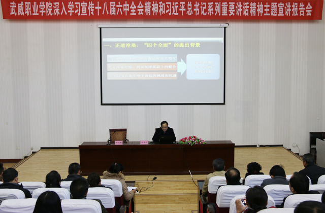 根據(jù)省委和全省宣傳工作會(huì)議關(guān)于在全省組織開(kāi)展深入學(xué)習(xí)宣傳十八屆五中全會(huì)精神和習(xí)近平總書(shū)記系列重要講話(huà)精神主題宣講活動(dòng)的通知要求,為向全院黨員干部和師生宣傳好、解讀好十八屆五中、六中全會(huì)精神和習(xí)近平總書(shū)記系列重要講話(huà)的實(shí)質(zhì)內(nèi)涵和深遠(yuǎn)意義,將全會(huì)精神和總書(shū)記系列重要講話(huà)精神作為指導(dǎo)和推動(dòng)學(xué)院各項(xiàng)事業(yè)快速發(fā)展的科學(xué)理論和強(qiáng)大動(dòng)力。10月29日上午,“武威職業(yè)學(xué)院深入學(xué)習(xí)宣傳十八屆五中、六中全會(huì)精神和習(xí)近平總書(shū)記系列重要講話(huà)精神主題宣講報(bào)告會(huì)”在學(xué)院尚德樓正德廳舉行。會(huì)議邀請(qǐng)省委講師團(tuán)成員、蘭州大學(xué)馬克思主義學(xué)院博士生導(dǎo)師王學(xué)儉教授蒞臨學(xué)院,作題為“四個(gè)全面”戰(zhàn)略布局解讀的宣講報(bào)告。學(xué)院黨委副書(shū)記趙明,副院長(zhǎng)王永緒、潘玉華、田迎春,全體中層干部,各部門(mén)師生代表共計(jì)260余人參加宣講報(bào)告會(huì)。報(bào)告會(huì)由田迎春主持。
