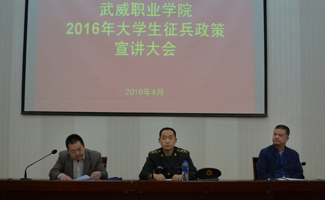 為支持國(guó)防建設(shè),鼓勵(lì)大學(xué)生參軍入伍保家衛(wèi)國(guó),學(xué)院于4月14日下午在尚德樓正德廳召開(kāi)了2016年大學(xué)生應(yīng)征入伍政策宣講暨動(dòng)員大會(huì)。學(xué)生工作處負(fù)責(zé)人王守云主持會(huì)議,涼州區(qū)人民武裝部政治工作科科長(zhǎng)趙輝泉、涼州區(qū)西關(guān)街政法書記趙光慶到場(chǎng)宣講。學(xué)院280多名師生參加了宣講大會(huì)。