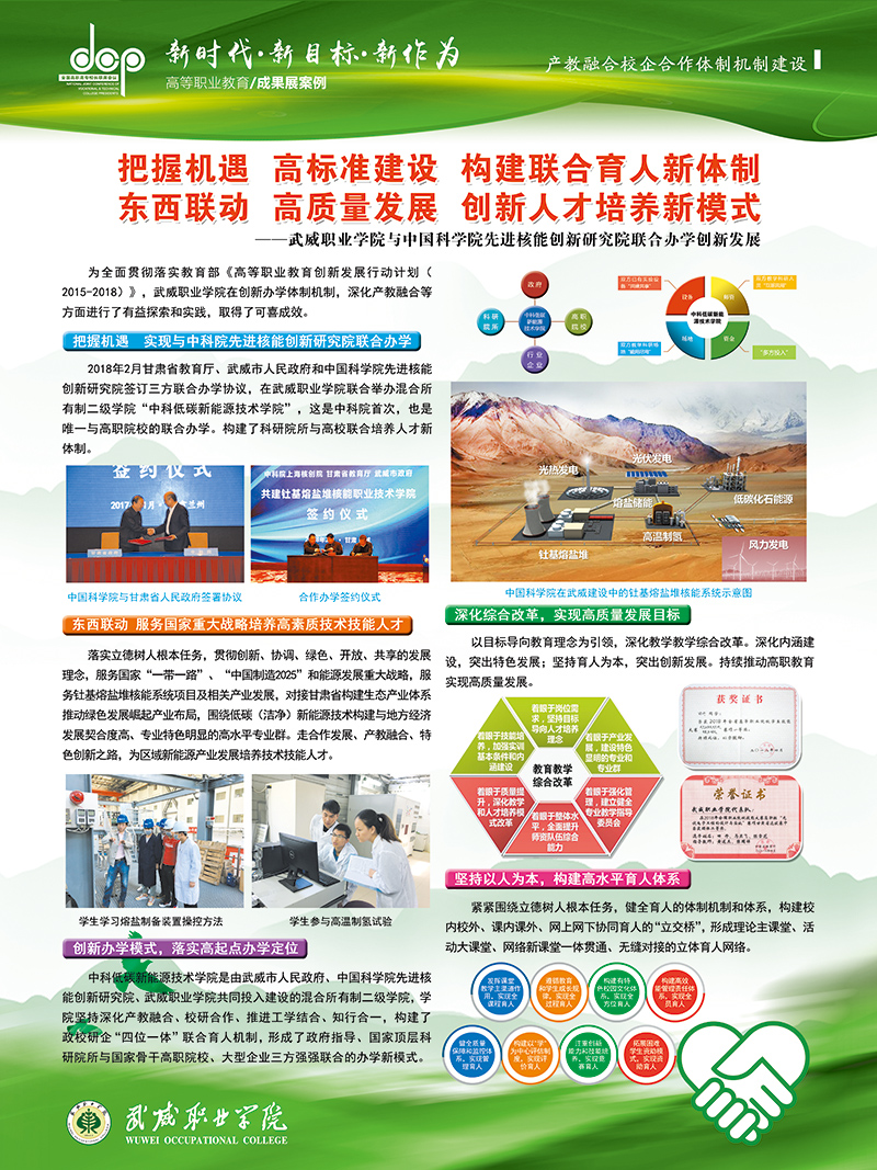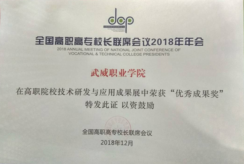 12月8日至9日,學(xué)院黨委書記、院長趙明教授、副院長翟存祥教授帶隊(duì)參加了在福建福州召開的全國高職高專校長聯(lián)席會議2018年年會。學(xué)院自主研發(fā)的“光伏組件智能清潔裝置”榮獲高職院校技術(shù)研發(fā)與應(yīng)用成果 “優(yōu)秀成果獎”(全國僅36所高職院校獲此殊榮,甘肅省僅2所),“學(xué)院與中科院先進(jìn)核能創(chuàng)新研究院聯(lián)合辦學(xué)創(chuàng)新發(fā)展”案例入選教育成果案例展。