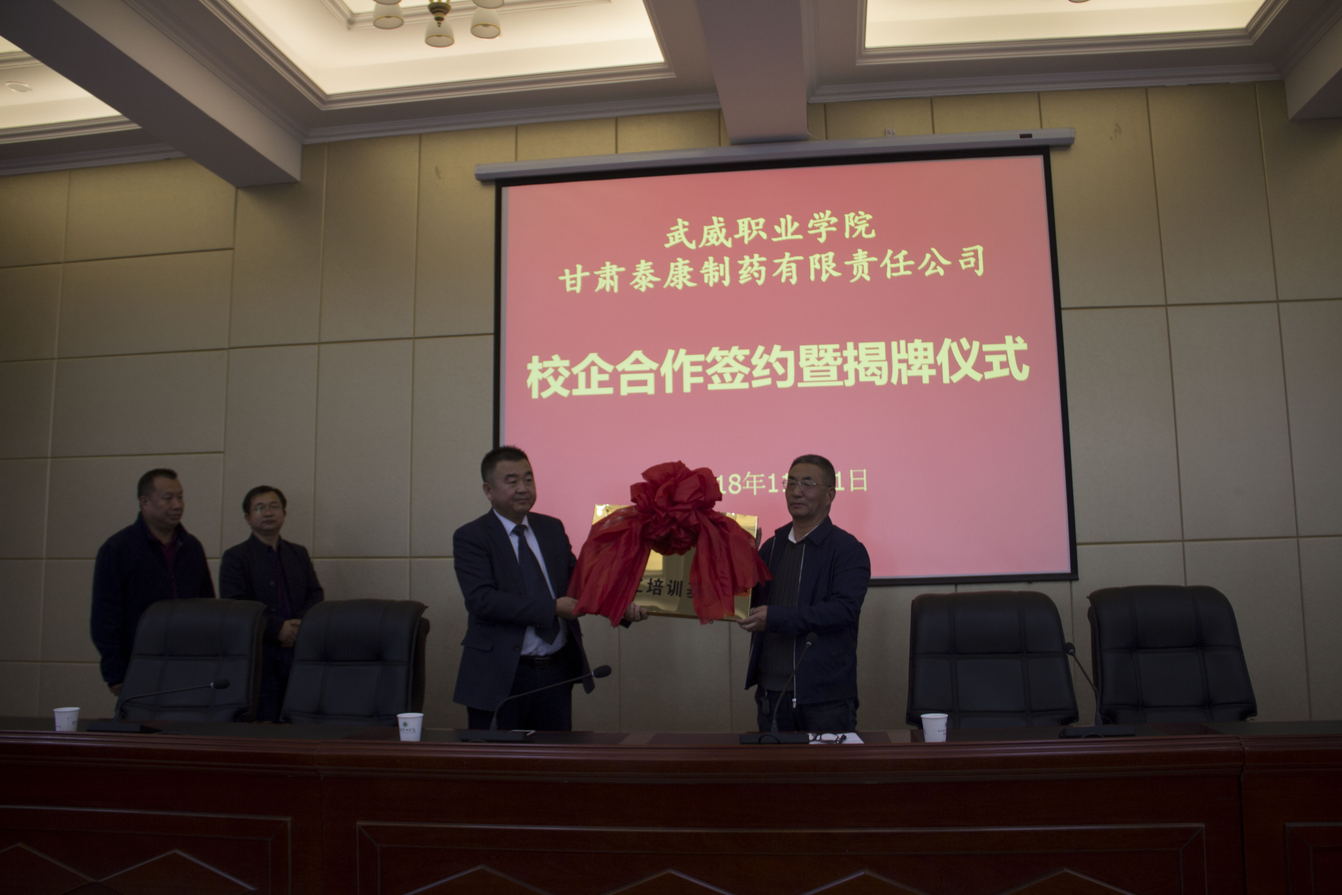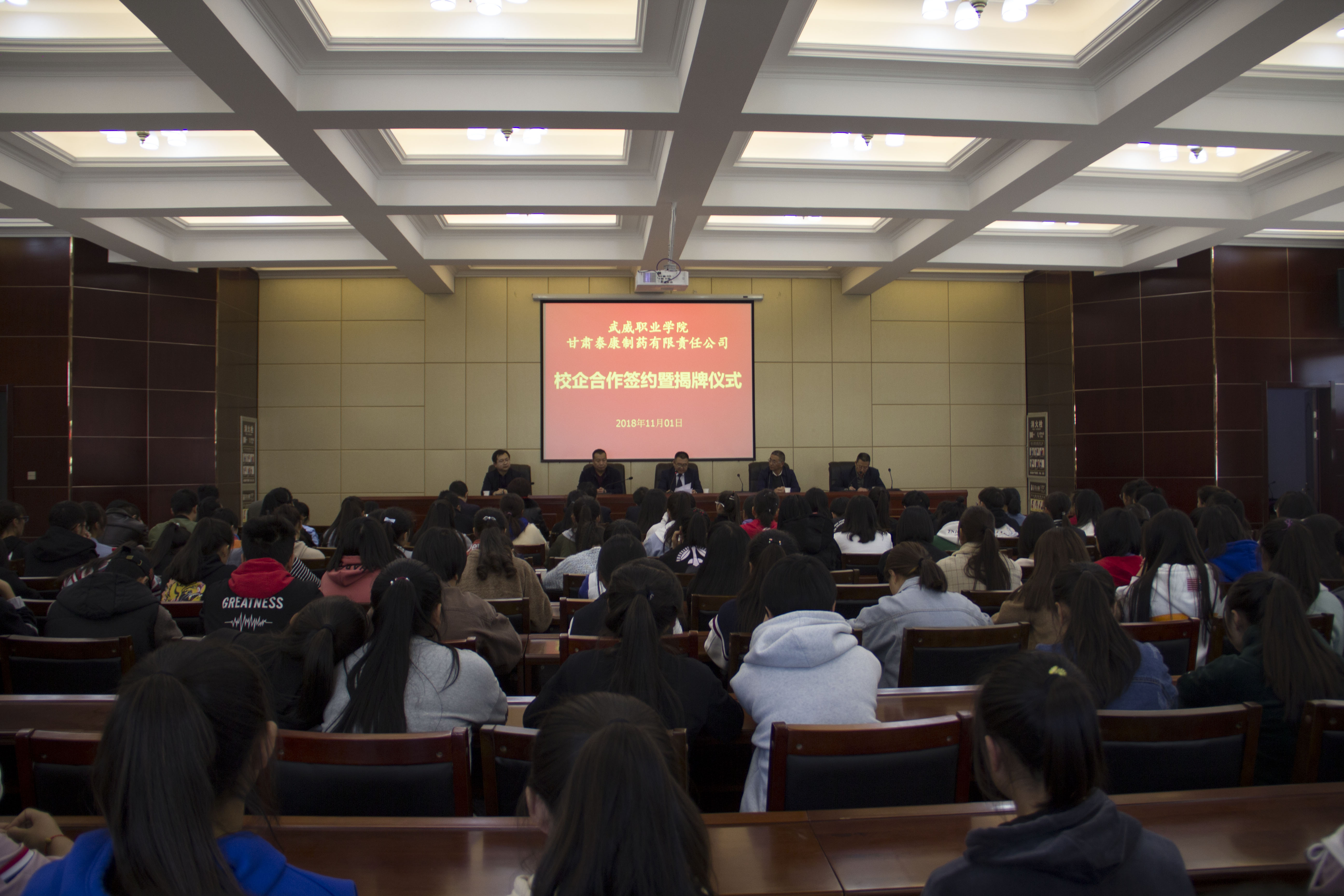 為提高人才培養(yǎng)質(zhì)量和辦學(xué)水平,加強校企協(xié)同育人機制建設(shè),11月1日下午,藥學(xué)系與甘肅泰康制藥有限責(zé)任公司校企合作共建“就業(yè)實習(xí)基地”簽約揭牌儀式在行樹樓北側(cè)會議室隆重舉行。甘肅泰康制藥有限責(zé)任公司投資方—北京久朝集團產(chǎn)業(yè)中心總監(jiān)楊宏超、公司總工程師毛著鴻、財務(wù)總監(jiān)郝敏等企業(yè)領(lǐng)導(dǎo)出席本次儀式。學(xué)院教務(wù)處處長仲生仁、招生就業(yè)處處長蔡柱山、藥學(xué)系主任魏潤明、副主任楊建美、黨總支副書記單光年及藥學(xué)系160余名師生參加了此次簽約揭牌儀式。儀式由魏潤明主持。