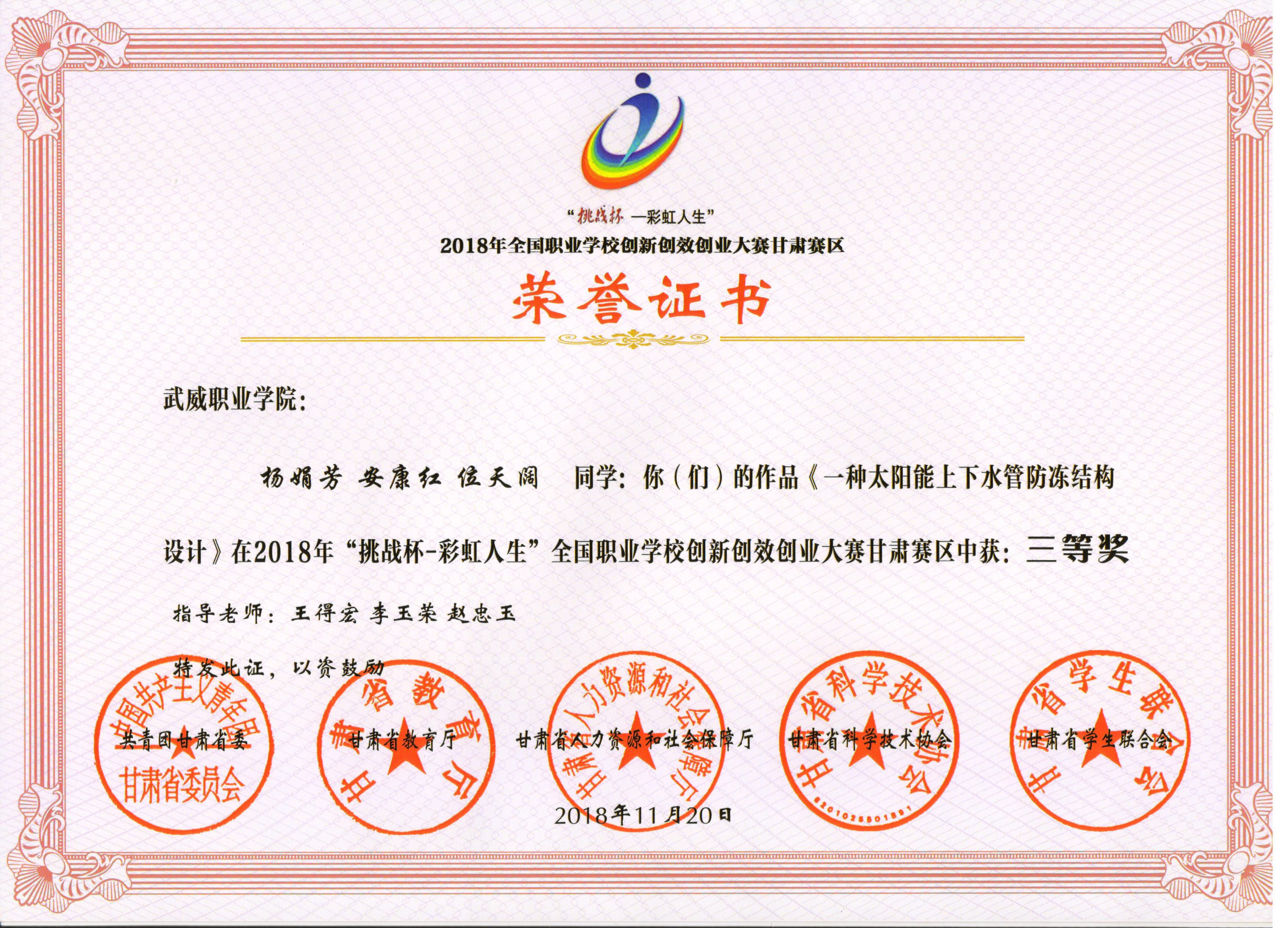 2018年“挑戰(zhàn)杯--彩虹人生”全國職業(yè)學(xué)校創(chuàng)新創(chuàng)效創(chuàng)業(yè)大賽甘肅賽區(qū)三等獎(jiǎng)