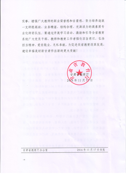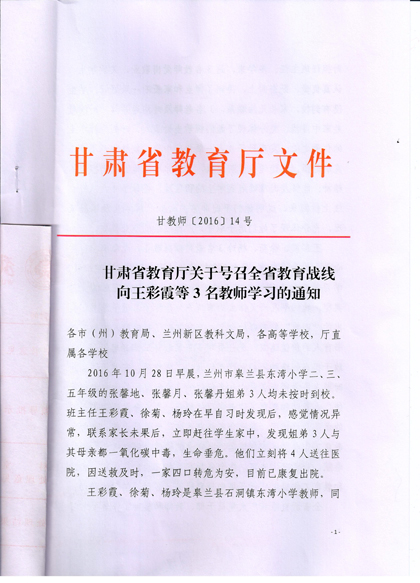 現(xiàn)將《甘肅省教育廳關(guān)于號(hào)召全省教育戰(zhàn)線向王彩霞等3名教師學(xué)習(xí)的通知》復(fù)印給你們,請(qǐng)認(rèn)真組織所屬教職工學(xué)習(xí)王彩霞、徐菊 、楊玲3名教師愛(ài)崗敬業(yè)、無(wú)私奉獻(xiàn)、愛(ài)心救人的先進(jìn)事跡。積極在院團(tuán)委、系團(tuán)總支,輔導(dǎo)員和班主任等學(xué)生管理隊(duì)伍中展開(kāi)學(xué)習(xí)研討活動(dòng),深入踐行社會(huì)主義核心價(jià)值觀,切實(shí)加強(qiáng)學(xué)院意識(shí)形態(tài)領(lǐng)域工作,唱響主旋律,大力弘揚(yáng)正能量。
