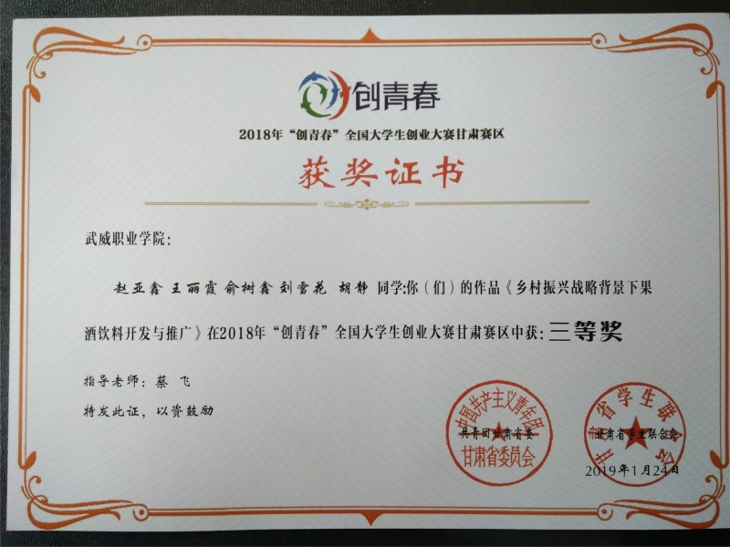 現(xiàn)代農(nóng)業(yè)技術(shù)系兩件作品獲得2018年“創(chuàng)青春”全國大學(xué)生創(chuàng)業(yè)大賽甘肅賽區(qū)三等獎(jiǎng)