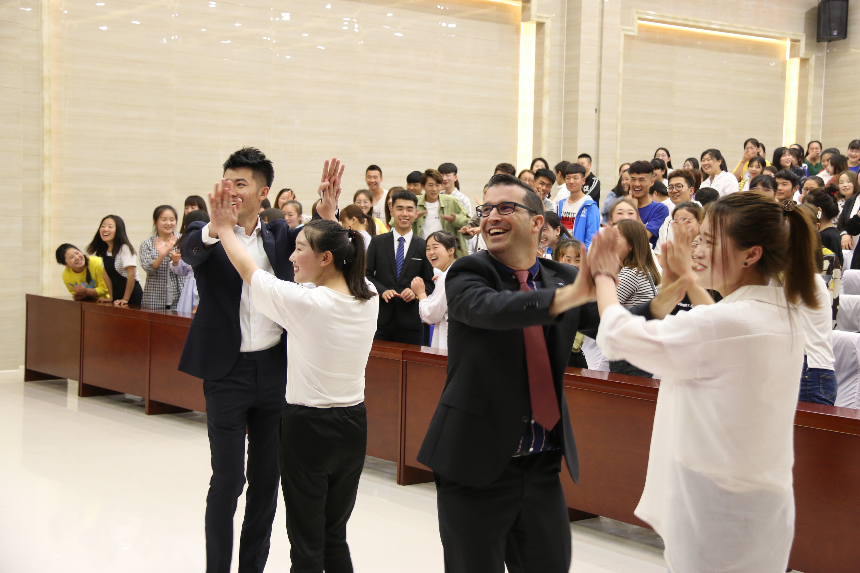 西班牙客人還到菁英廳參加了學(xué)院組織的學(xué)生見(jiàn)面會(huì)。Contreras 先生和同學(xué)們進(jìn)行了語(yǔ)言、歌曲、舞蹈雙向互動(dòng),讓在場(chǎng)所有同學(xué)體驗(yàn)了濃烈的西班牙異域文化,同學(xué)們近距離感受了西班牙客人的熱情奔放、幽默詼諧。Contreras 先生對(duì)學(xué)院學(xué)生的積極主動(dòng)、大膽參與互動(dòng)留下了深刻印象。護(hù)理系、人文藝術(shù)教育系、能源工程系、電子信息工程系等系學(xué)生代表參加活動(dòng)。