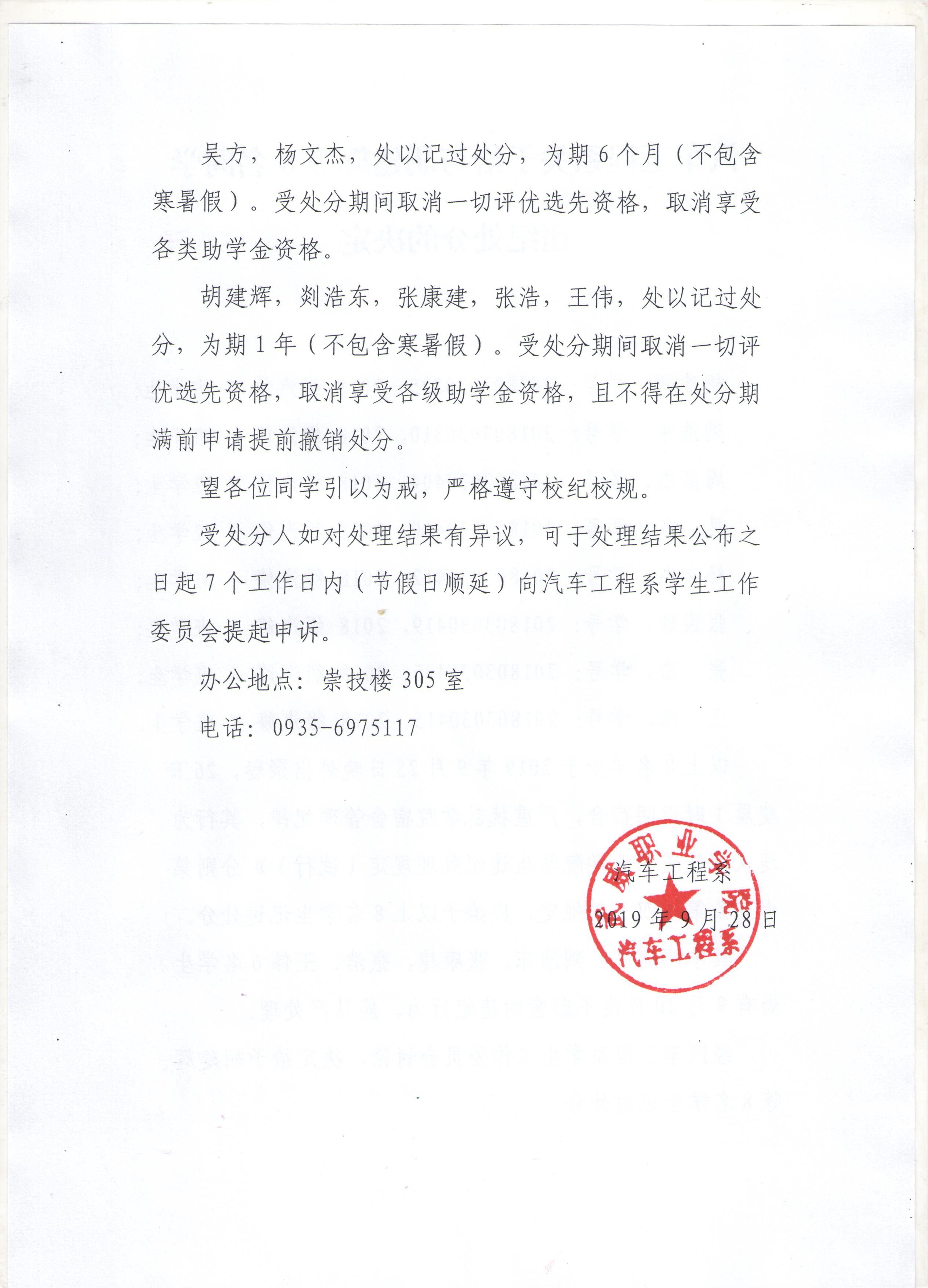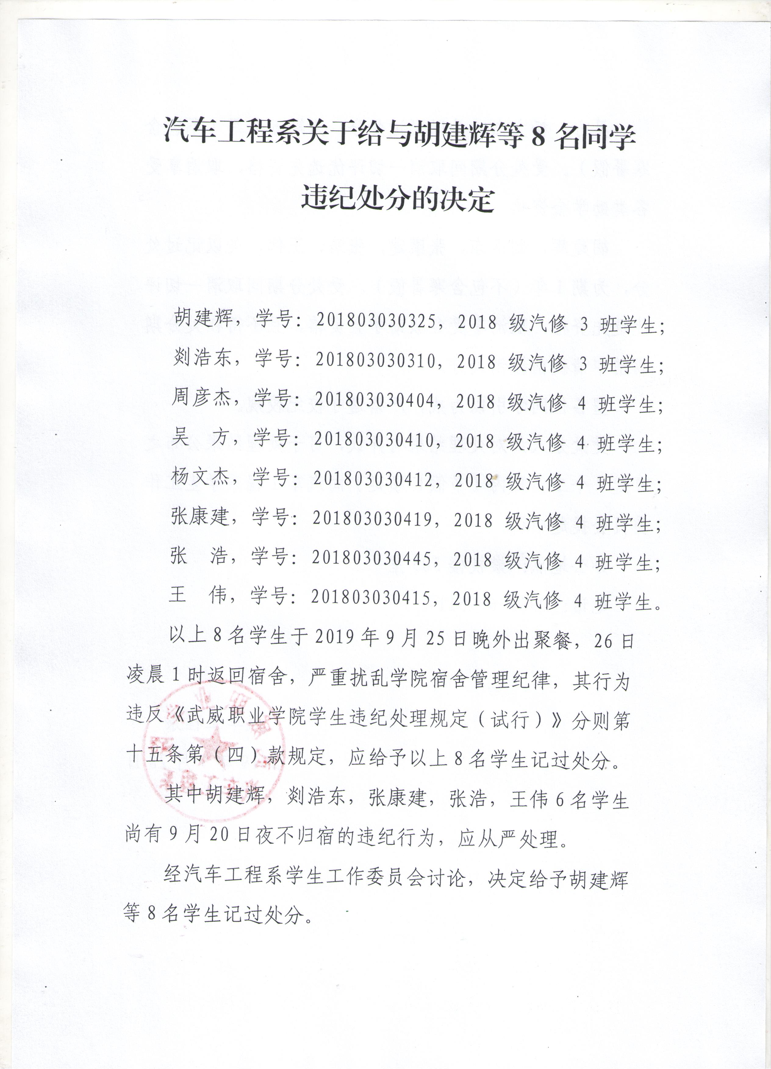 汽車工程系關(guān)于給與胡建輝等8名同學(xué)違紀(jì)處分的決定
