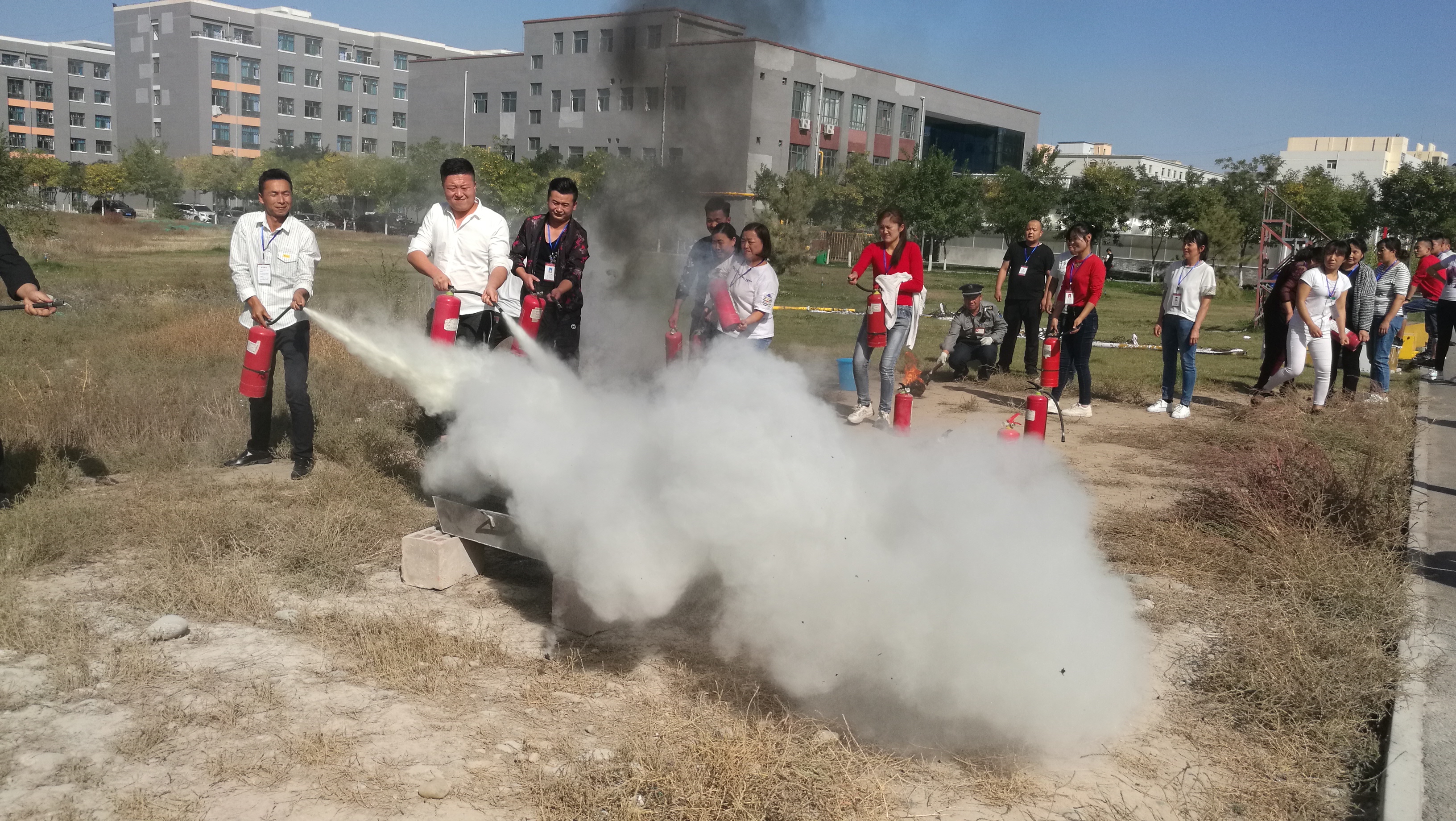 培訓(xùn)中,保衛(wèi)處負(fù)責(zé)人向參加人員講解了火災(zāi)應(yīng)急處置、消防設(shè)施使用及維護(hù)等方面的知識(shí)。隨后,所有參加人員在操場空地進(jìn)行了干粉滅火器滅火演練,每位參加人員都情緒飽滿、積極參與,最終有序完成了培訓(xùn)。