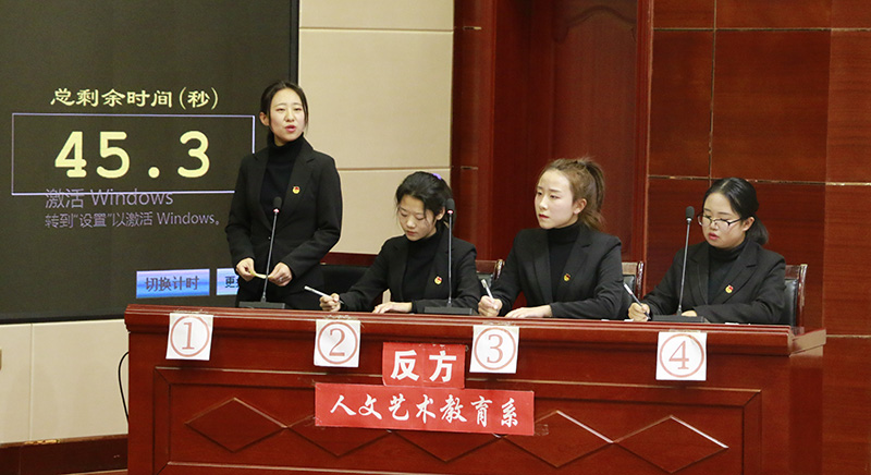 經過四輪11場次的比賽,電子信息工程系代表隊和人文藝術教育系代表隊進入最后決賽。比賽現(xiàn)場,正方電子信息工程系代表隊和反方人文藝術教育系代表隊針對企業(yè)用人以“才”還是以“德”為先拉開激烈交戰(zhàn)。雙方選手在立論、駁立論、攻辯等各個環(huán)節(jié)中思路清晰,引經據(jù)典,字字珠璣,使現(xiàn)場氣氛迅速升溫。在自由辯論環(huán)節(jié)中,雙方選手就辯題展開更深層次的辯論,個個妙語連珠、你來我往、侃侃而談,場下掌聲連連。整場比賽高潮迭起,精彩不斷,觀眾也積極參與互動,現(xiàn)場氣氛十分活躍。經過激烈的角逐,人文藝術教育系代表隊表現(xiàn)更勝一籌,獲得本屆辯論賽冠軍,電子信息工程系榮獲本屆比賽亞軍,醫(yī)學技術與信息管理系榮獲季軍,能源工程系榮獲 “優(yōu)秀辯隊”,人文藝術教育系楊婉瑩、電子信息工程系楊曉紅和能源工程系萬寶紅3位同學榮獲 “最佳辯手”。