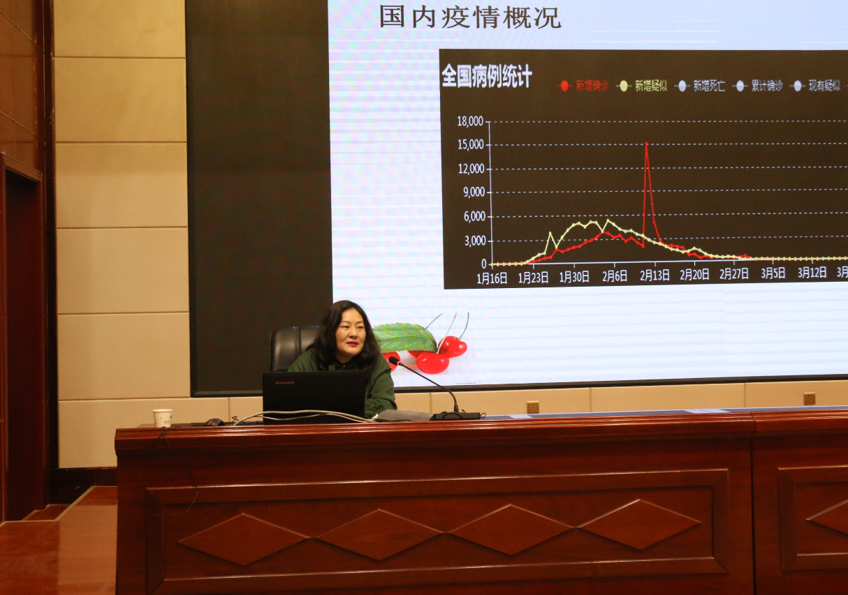 馬艷主任以《新冠肺炎疫情防控》為題,從國內(nèi)外疫情分析、對新冠肺炎的認識、大專院校新冠肺炎疫情防控要求措施以及開學后應該注意哪些問題等幾個方面做了深入講解。