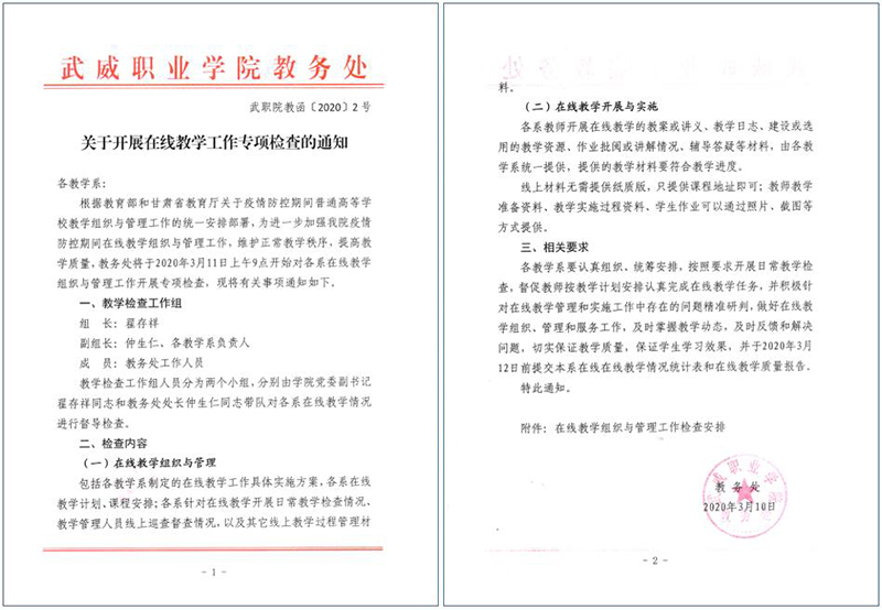 各院系及相關(guān)部門要按照教育部和省教育廳關(guān)于疫情防控期間在線教學(xué)工作的文件精神和《武威職業(yè)學(xué)院新型冠狀病毒肺炎疫情防控期間在線教學(xué)工作實施方案》的相關(guān)要求進行全面自查,做到文件精神及要求全部落實到位、不打折扣;對執(zhí)行情況進行認真總結(jié),通過自查深入挖掘現(xiàn)階段在線教學(xué)實施和組織管理過程中的重點問題,利用各系教研活動和教研團隊推動開展教學(xué)研究和人才培養(yǎng)模式改革研究,全面落實問題導(dǎo)向,推動在線教學(xué)工作落實落細落地。