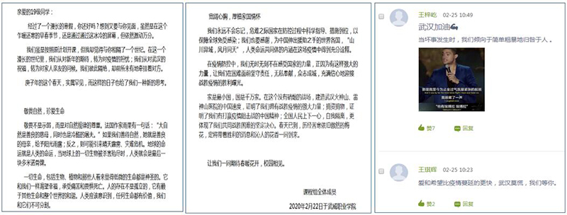 《中華優(yōu)秀傳統(tǒng)文化》課程團(tuán)隊(duì)的馮文娟老師在開學(xué)第一天借助在線教學(xué)平臺向?qū)W生推送了《致2019級學(xué)生的一封信》,激勵學(xué)生要敬畏自然、珍愛生命,致敬英雄、感恩榜樣,寬闊心胸、厚植家國情懷。信中這樣寫道:“在疫情防控中,我們無時無刻不在感受國家的力量,正因?yàn)橛羞@樣強(qiáng)大的力量,讓我們在困難面前堅(jiān)守責(zé)任,無私奉獻(xiàn),眾志成城,充滿信心地迎接戰(zhàn)勝疫情的勝利曙光。”“ 家是最小國,國是千萬家。在這個沒有硝煙的戰(zhàn)場,建造武漢火神山、雷神山醫(yī)院的中國速度,證明了我們擁有戰(zhàn)勝疫情的強(qiáng)大力量;捐資捐物,證明了我們有打贏疫情阻擊戰(zhàn)的中國精神;全國人民上下一心,自我隔離,更體現(xiàn)了我們共同戰(zhàn)勝困難的堅(jiān)定決心。春天已到,歷經(jīng)苦寒依舊傲然的梅花,定將帶著勝利的消息和沁人的花香一同到來?!蓖瑫r,為學(xué)生推送由央視頻和有道精品課共同錄制的《面對疫情教你如何有效防范》疫情防控專題視頻,與學(xué)生一起為打贏新冠肺炎疫情防控阻擊戰(zhàn)貢獻(xiàn)力量。