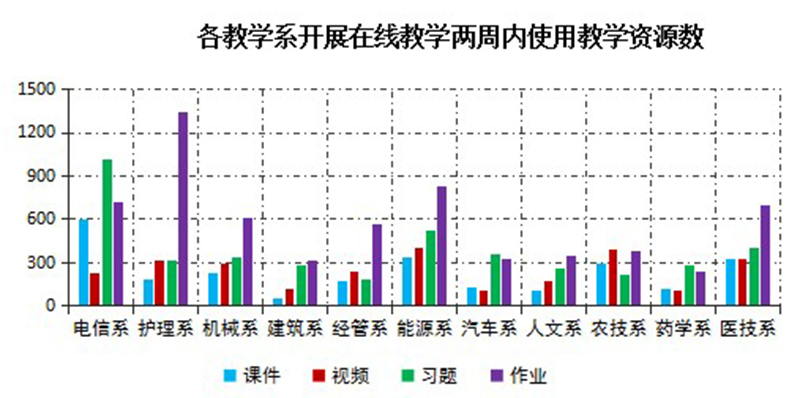 根據(jù)學(xué)院教學(xué)平臺管理數(shù)據(jù)和各教學(xué)系反饋數(shù)據(jù),開課兩周內(nèi)全院開展在線教學(xué)教師共有263人,開設(shè)課程284門;學(xué)院兩周內(nèi)授課課時總數(shù)達(dá)到1949學(xué)時,教師開展在線教學(xué)3334人次;發(fā)布作業(yè)共計(jì)1306次,組織答疑討論1918次。教師教學(xué)形式靈活多樣,對教學(xué)平臺及教學(xué)工具的熟練程度逐漸提升,教師討論交流的主題從基礎(chǔ)性的上傳資源、組織教學(xué)、組織教學(xué)等轉(zhuǎn)變?yōu)樽鳂I(yè)發(fā)布、主題討論、學(xué)情數(shù)據(jù)分析,在線教學(xué)工作步入正軌。