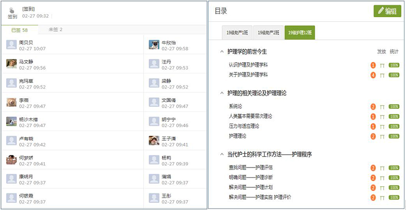 根據(jù)教學(xué)實(shí)際,護(hù)理制定了線上教學(xué)工作方案,對線上教學(xué)工作做出統(tǒng)一安排,強(qiáng)調(diào)了線上教學(xué)督導(dǎo)、任課教師和班主任的具體工作職責(zé)。2月24日,各項(xiàng)教學(xué)工作有序開展。共24名教師完成 11門課程的在線教學(xué)任務(wù),主要依托學(xué)院在線教學(xué)平臺、中國大學(xué)MOOC、人衛(wèi)慕課、智慧職教平臺上完成授課,上課學(xué)生1510人。通過多層次多方位的監(jiān)控?cái)?shù)據(jù)分析,全系在線教學(xué)整體運(yùn)行平穩(wěn)有序,管理人員組織管理到位,教師盡職盡責(zé),課堂授課方式靈活多樣,學(xué)生積極互動,在線教學(xué)課堂效果良好,達(dá)到預(yù)期。學(xué)生平均到課率達(dá)到99%以上,積極落實(shí)了在線教學(xué)對學(xué)生“全覆蓋”的要求。教師在教學(xué)平臺上完成視頻、電子教材、PPT等資源上傳,積極開展課前預(yù)習(xí)、主題討論、隨堂測驗(yàn)、作業(yè)布置等各類線上課堂教學(xué)活動,充分調(diào)動學(xué)生的學(xué)習(xí)主動性,學(xué)習(xí)效果良好。