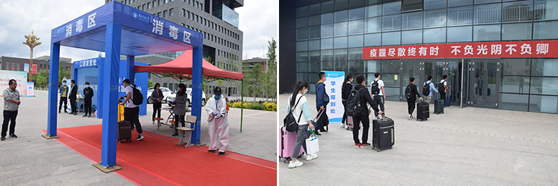 學院在校門口設置了測溫通道,消毒區(qū)、口罩發(fā)放區(qū)、臨時觀察區(qū)等,為同學們的健康安全保駕護航。學生到校后,依次通過測溫區(qū)、消毒區(qū),經工作人員嚴格的測溫和消毒后,更換口罩到指定地點報到。