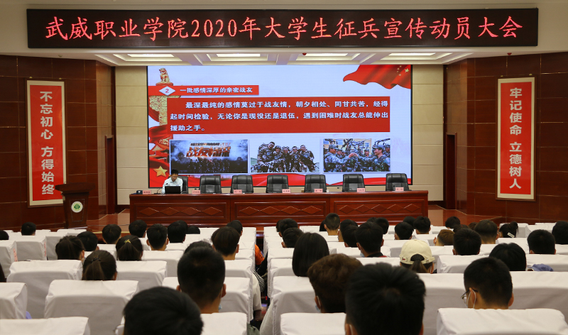 6月10日上午,學(xué)院2020年大學(xué)生征兵宣傳動員大會在菁英廳舉行。武威軍分區(qū)司令員張國輝、武威軍分區(qū)動員處處長劉忠、涼州區(qū)人武部部長闞延貴、涼州區(qū)人武部政委丁俊強,學(xué)院黨委書記、院長趙明,副院長何毅出席會議。各院系負(fù)責(zé)人、輔導(dǎo)員和學(xué)生代表共200人參加了會議。會議由副院長王守云主持。