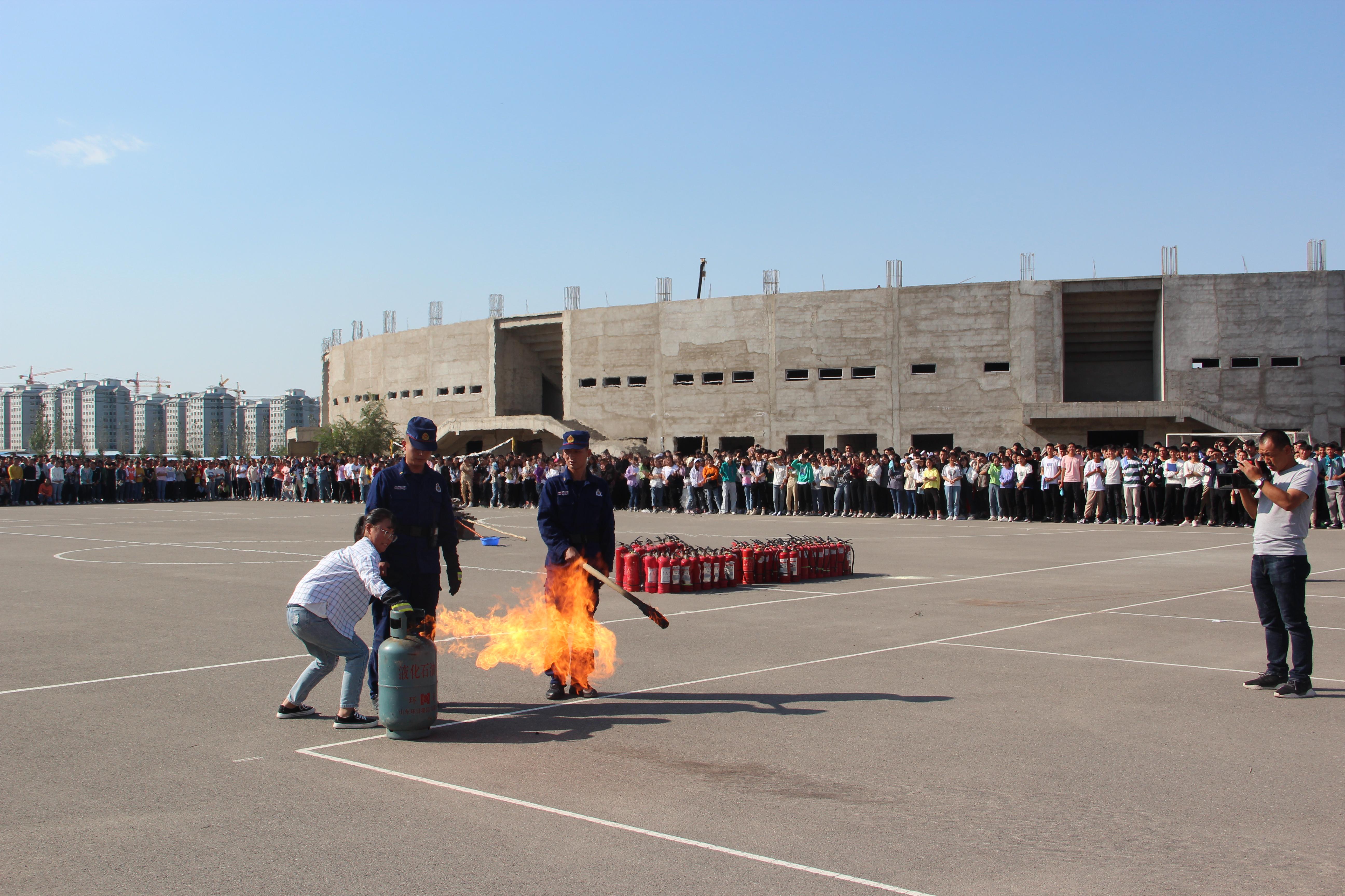 隨后,2019級新生整隊到操場參加了滅火演練。在消防隊員的講解和示范下,同學(xué)們現(xiàn)場學(xué)習(xí)了應(yīng)急逃生和消防安全常識,部分師生代表、食堂工作人員親身體驗了處置滅火器著火液化氣瓶、干粉滅火、通過模擬煙室逃生等操作。
