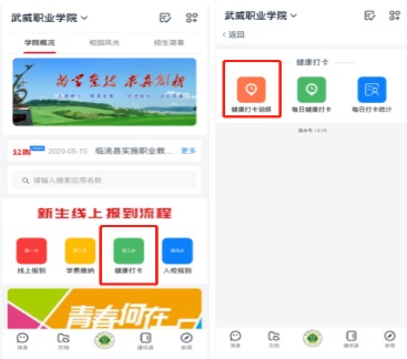 新生使用“智慧校園”賬號(hào),登錄釘釘平臺(tái),進(jìn)入“武威職業(yè)學(xué)院”組織架構(gòu),點(diǎn)擊武職門(mén)戶進(jìn)入新生線上報(bào)到流程。
