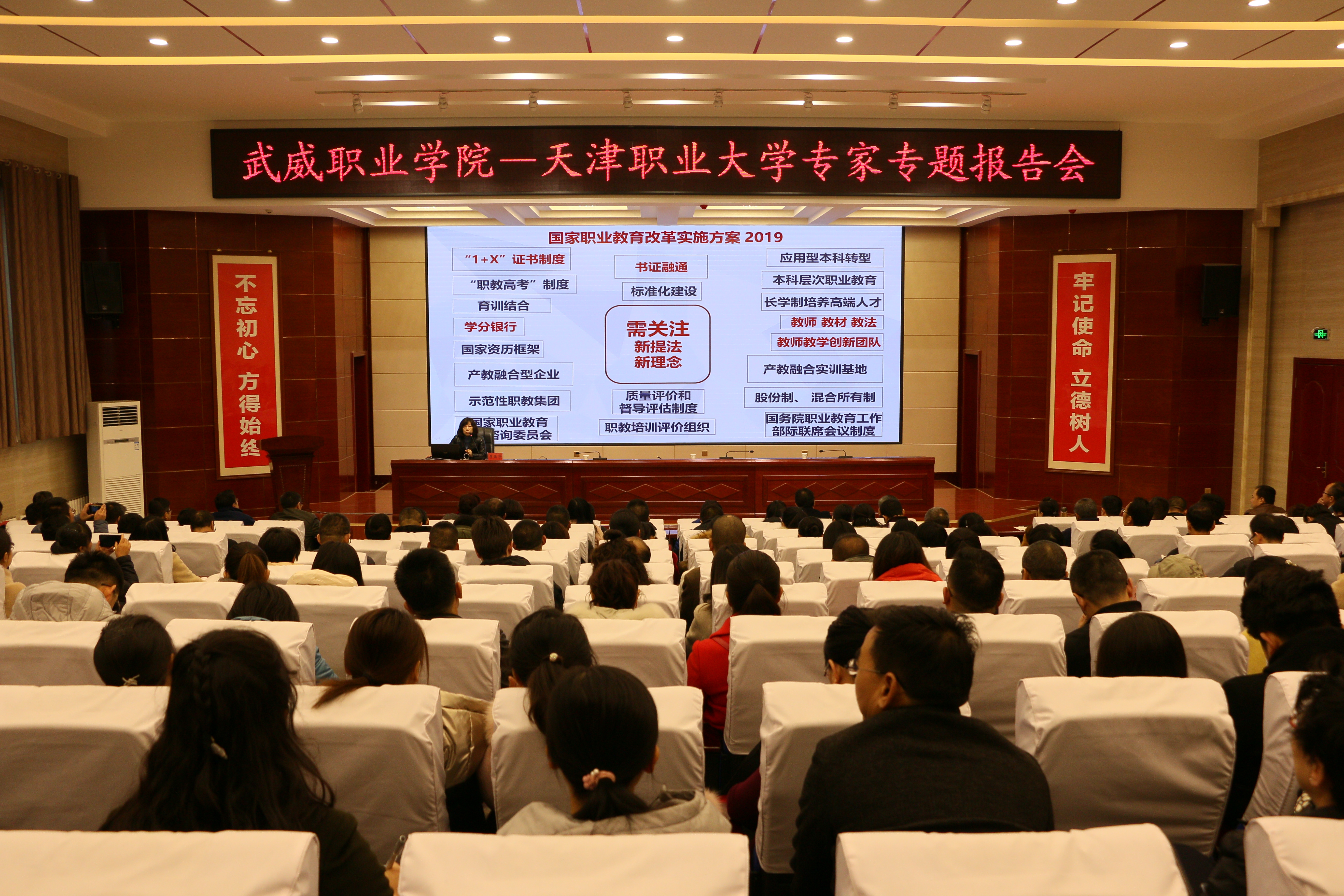 11月20日,武威職業(yè)學(xué)院“綠洲講壇”第27期在學(xué)院菁英廳舉行,本期活動(dòng)邀請(qǐng)到天津職業(yè)大學(xué)汽車學(xué)院院長(zhǎng)李晶華作主題為“《國家職業(yè)教育改革實(shí)施方案》解讀”的報(bào)告。學(xué)院領(lǐng)導(dǎo)班子、中層干部、教師代表220余人參加了報(bào)告會(huì)。本期講壇由學(xué)院黨委書記、院長(zhǎng)趙明主持。