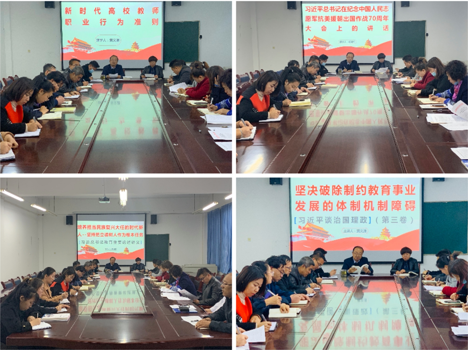 黃文源領(lǐng)學(xué)了《習(xí)近平談治國(guó)理政》(第三卷)第十二條 提高保障和改善民生水平——堅(jiān)決破除制約教育事業(yè)發(fā)展的體質(zhì)機(jī)制障礙,解讀了《新時(shí)代高校教師職業(yè)行為十項(xiàng)準(zhǔn)則》,要求所有教師要做以德立身、以德立學(xué)、以德施教、以德育德的楷模。楊如松領(lǐng)學(xué)了《習(xí)近平總書記教育重要論述講義》第二講 培養(yǎng)擔(dān)當(dāng)民族復(fù)興大任的時(shí)代新人——堅(jiān)持把立德樹人作為根本任務(wù)。楊建紅老師領(lǐng)學(xué)了習(xí)近平總書記在紀(jì)念中國(guó) 人民志愿軍抗美援朝出國(guó)作戰(zhàn)70周年大會(huì)的講話。