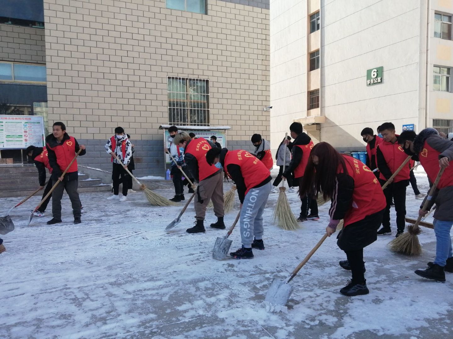 本次鏟雪的區(qū)域是教學(xué)樓區(qū)域的主干道和食堂門前道路。寒冷的天氣擋不住大家的勞動熱情,厚厚的冰塊蓋不住大家的志愿精神。鐵鍬聲此起彼伏,大家分工明確,相互合作,現(xiàn)場氣氛熱烈。經(jīng)過多小時的勞動,大家將教學(xué)樓前主干道積雪基本清掃干凈。