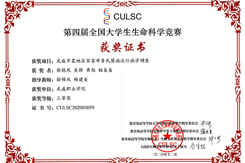 近日,第四屆全國大學(xué)生生命科學(xué)競賽落下帷幕,經(jīng)過激烈角逐,我院推薦參賽的兩個(gè)項(xiàng)目獲得全國二等獎(jiǎng)和三等獎(jiǎng),學(xué)院成為省內(nèi)獲得此次全國比賽獎(jiǎng)項(xiàng)的唯一高職院校。在此前舉辦的甘肅賽區(qū)比賽中,我院兩個(gè)項(xiàng)目獲得甘肅省一等獎(jiǎng)1項(xiàng),二等獎(jiǎng)1項(xiàng),被推薦參加全國總決賽。此次獲得全國競賽獲獎(jiǎng)不僅填補(bǔ)了我院學(xué)生在全國競賽中獲獎(jiǎng)的空白,也為學(xué)院創(chuàng)建“雙高”院校增添了重要成果。