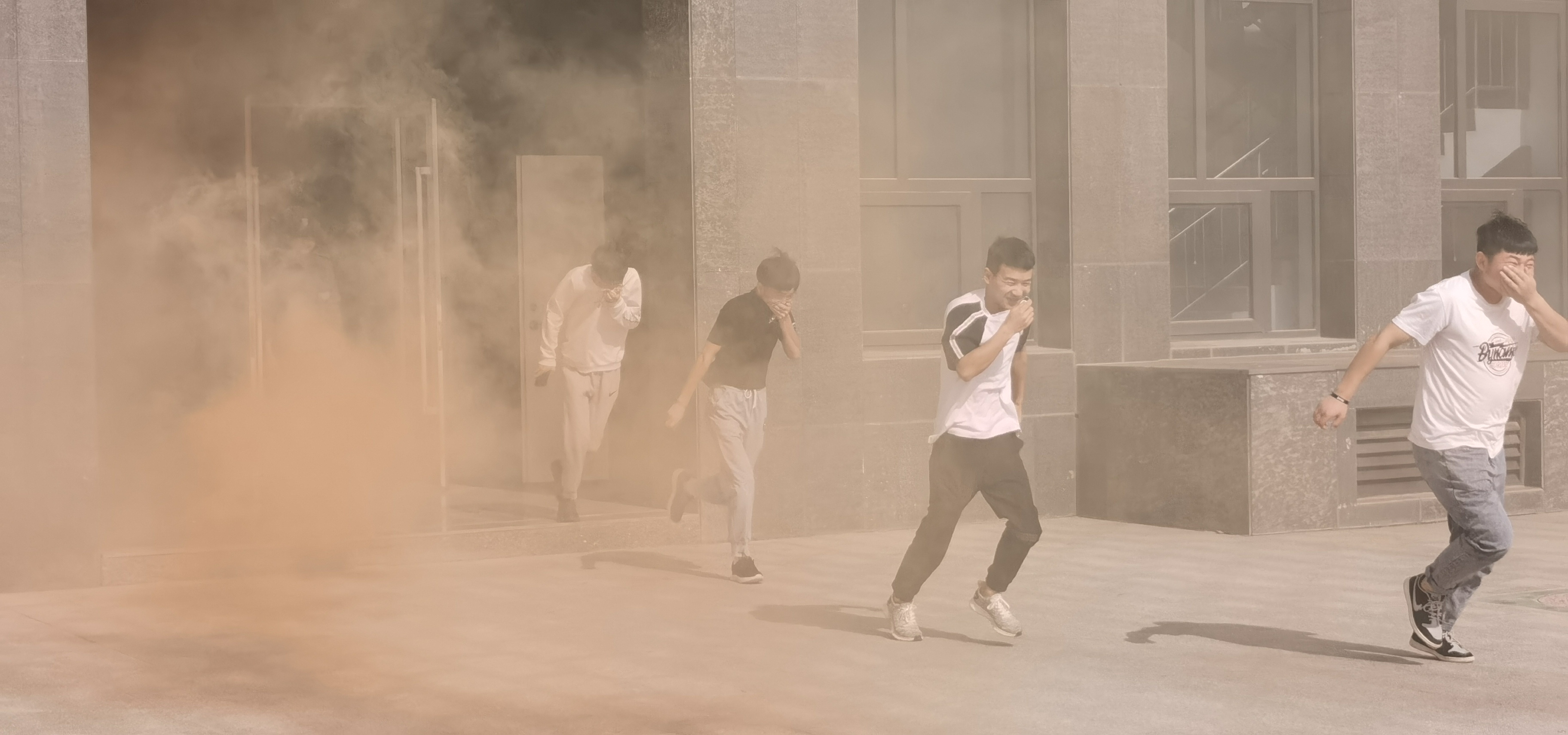 下午4點46分,疏散演練正式開始。隨著消防警報響起,各教學班上課教師立即停止上課組織學生疏散,學生用濕毛巾捂住口鼻,按照逃生路線有序疏散。在5分鐘內,8000多名參演師生全部撤離到安全地帶,演練取得圓滿成功。