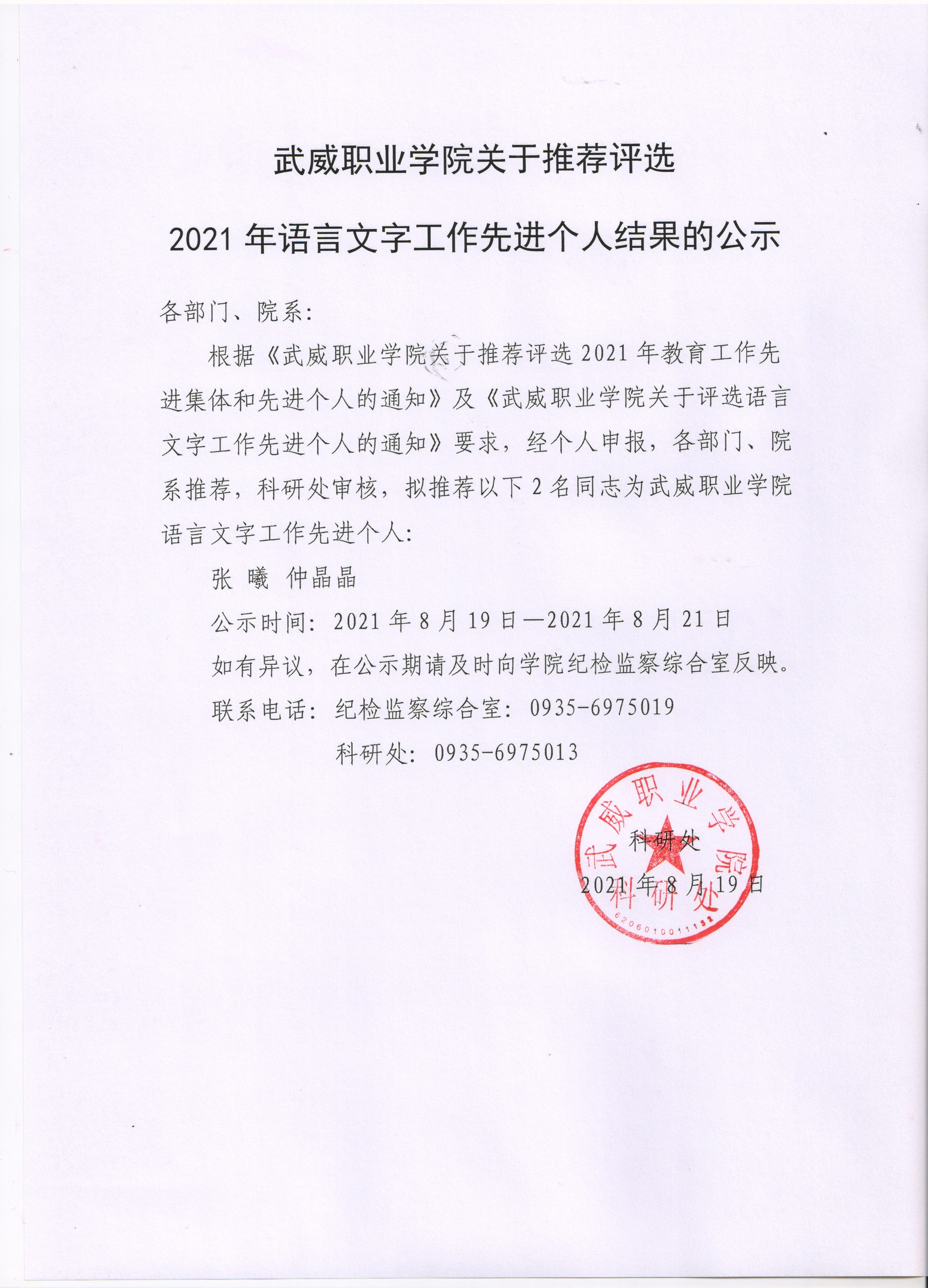 武威職業(yè)學(xué)院關(guān)于推薦評(píng)選2021年語言文字工作先進(jìn)個(gè)人結(jié)果的公示
