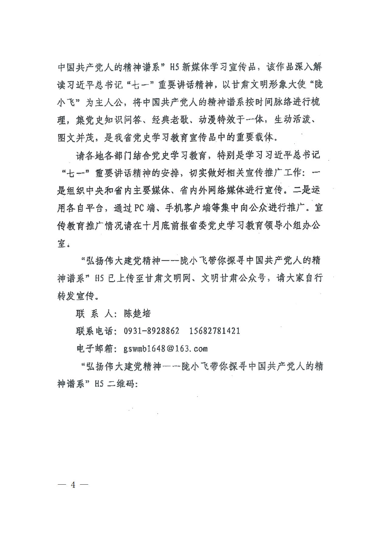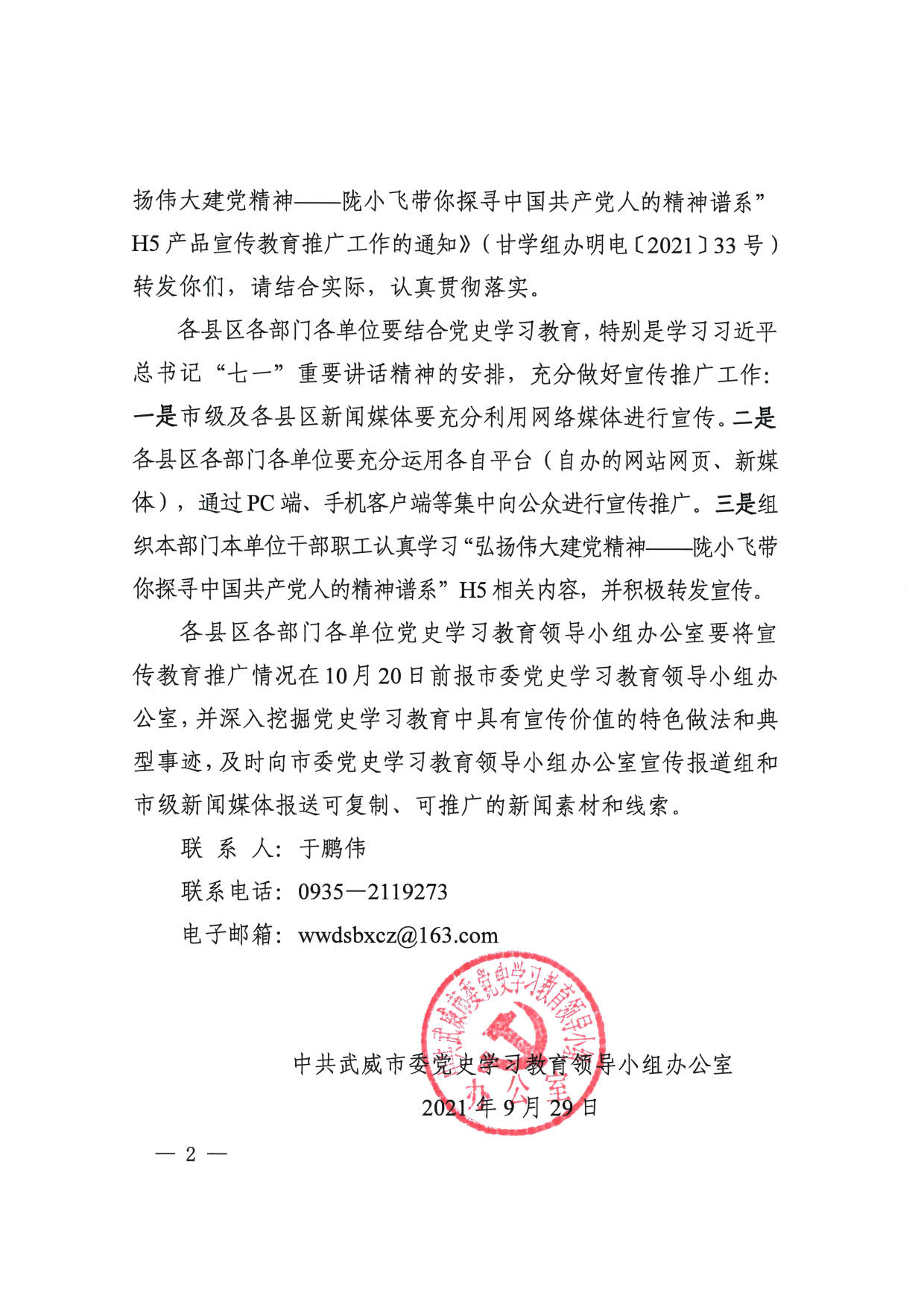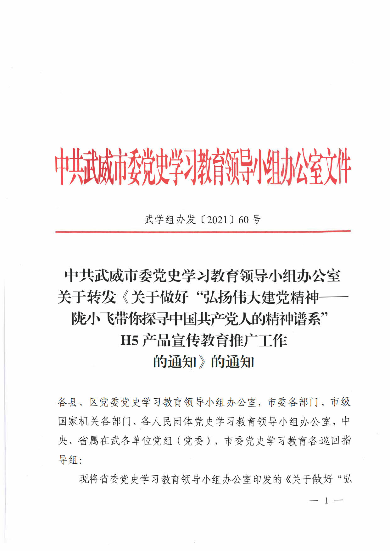 中共武威市委黨史學(xué)習(xí)教育領(lǐng)導(dǎo)小組辦公室關(guān)于轉(zhuǎn)發(fā)〈關(guān)于做好 “弘揚(yáng)偉大建黨精神——隴小飛帶你探尋中國共產(chǎn)黨人的精神譜系”H5產(chǎn)品宣傳教育推廣工作的通知〉的通知