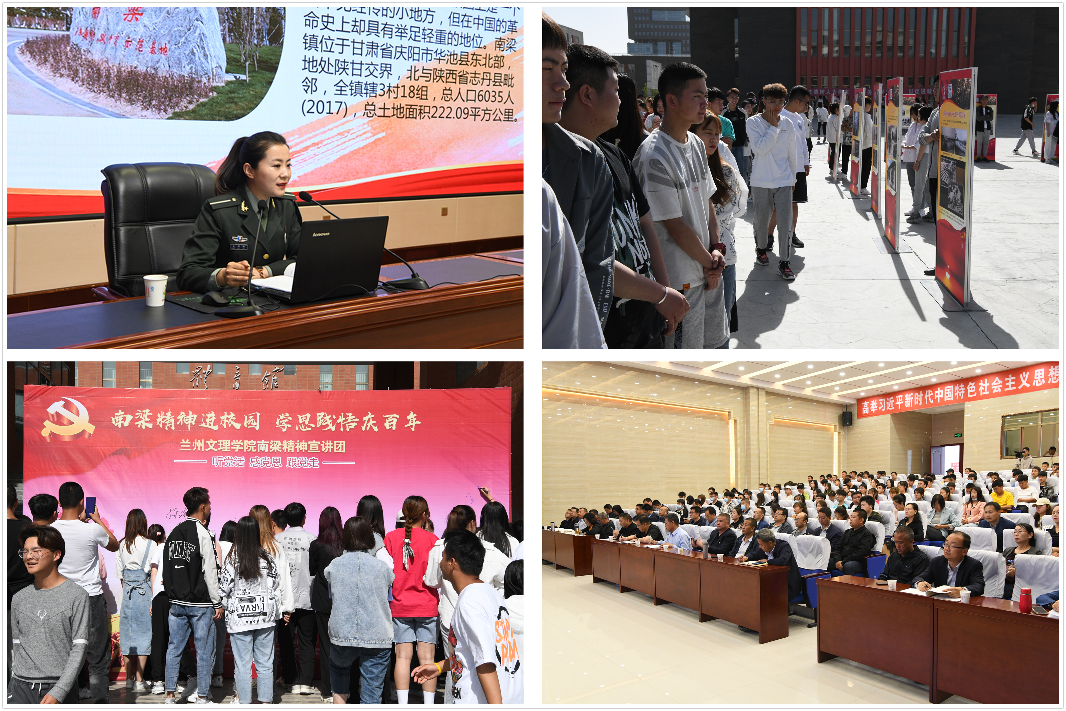 與此同時,“講好南梁故事·永遠跟黨走”主題展覽在大學(xué)生活動中心前廣場開展,師生聆聽了南梁革命紀念館講解員的生動講解,全面了解了劉志丹、謝子長、習(xí)仲勛等老一輩無產(chǎn)階級革命家在陜甘地區(qū)高舉旗幟,創(chuàng)建以南梁為中心的陜甘革命根據(jù)地,積極探索救國救民的道路的光輝事跡和偉大精神。師生們紛紛表示要以革命先烈為榜樣,不忘初心,牢記使命,學(xué)習(xí)傳承老一輩無產(chǎn)階級革命家的革命精神,爭做傳承和弘揚南梁精神的踐行者。