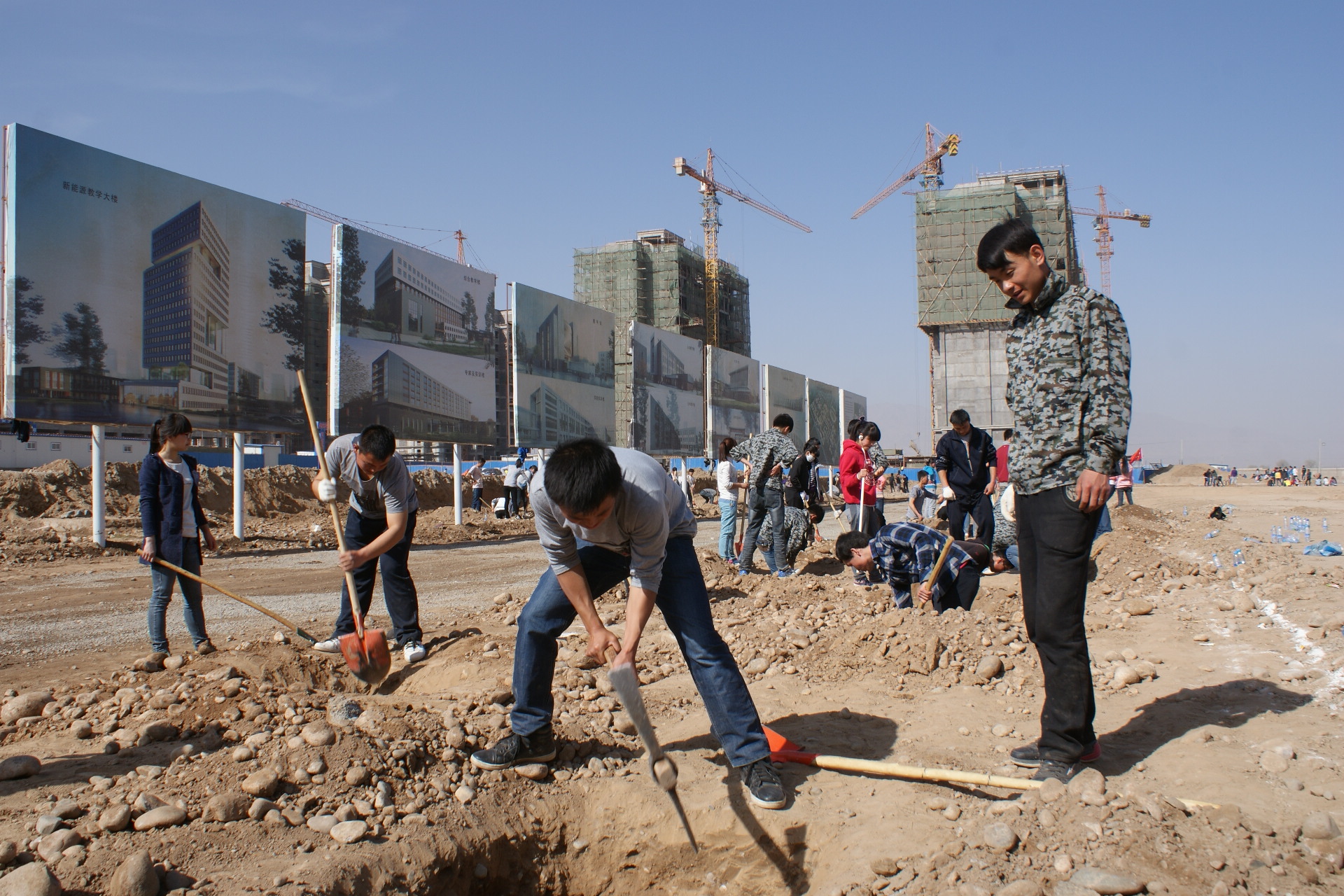 植樹現(xiàn)場一派忙碌的景象,大家有秩序地領(lǐng)取工具,三五一組,分工明確,揮動鎬頭,掘土挖坑,再將一顆顆樹苗埋窩、培土、踩實(shí)、澆灌。經(jīng)過三天的緊張勞作,我系師生在指定區(qū)域完成了280個(gè)樹坑的開挖和樹木栽植任務(wù)。
