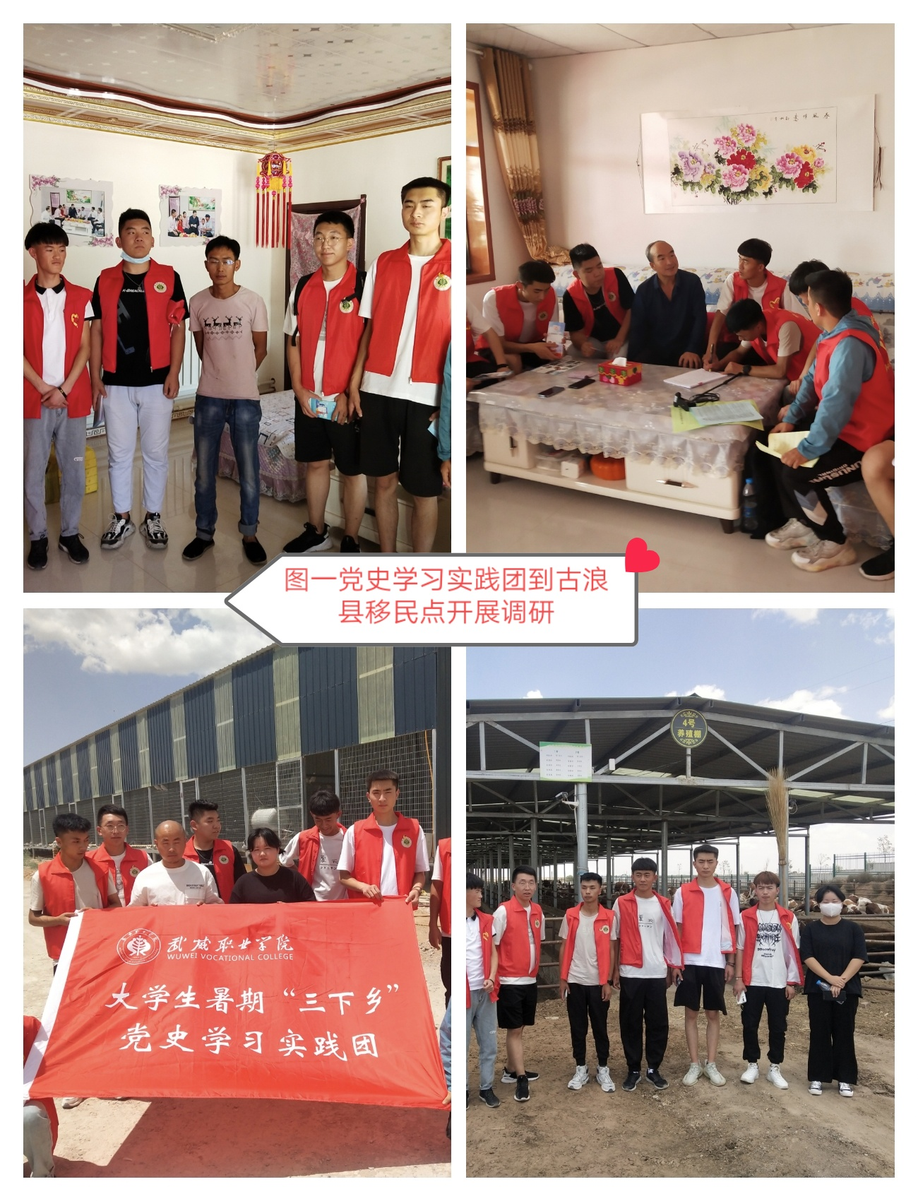 同學(xué)們來到了古浪縣黃花灘移民點(diǎn),在富民新村全國(guó)脫貧攻堅(jiān)先進(jìn)個(gè)人-富民新村黨支部書記張延堂給同學(xué)們進(jìn)行了講解,古浪縣支持貧困群眾自種自養(yǎng)發(fā)展產(chǎn)業(yè),打造移民區(qū)萬畝戈壁農(nóng)業(yè)、萬只種羊繁育、萬頭肉牛養(yǎng)殖、萬畝枸杞種植等高標(biāo)準(zhǔn)示范基地,全縣建成日光溫室1.4萬座2.8萬畝、養(yǎng)殖暖棚17.99萬座1079.4萬平方米,設(shè)施果蔬年產(chǎn)量達(dá)到6.5萬噸以上,牛、羊、雞、鴿存欄量分別達(dá)到6.95萬頭、202萬只、226萬只、9.1萬羽。來到李應(yīng)川家,新房子里溫煦如春。屋里依舊如2019年8月總書記來時(shí)來時(shí)那樣干凈整潔,唯一不同的是醒目地?cái)[了一幅習(xí)近平總書記的剪紙畫像。李應(yīng)川兒子給同學(xué)們講:“現(xiàn)在我家的養(yǎng)殖、種植都搞起來了,盼望著總書記還能來我家看看,嘗嘗我們自己家里產(chǎn)的新鮮羊肉?。ㄈ鐖D一)