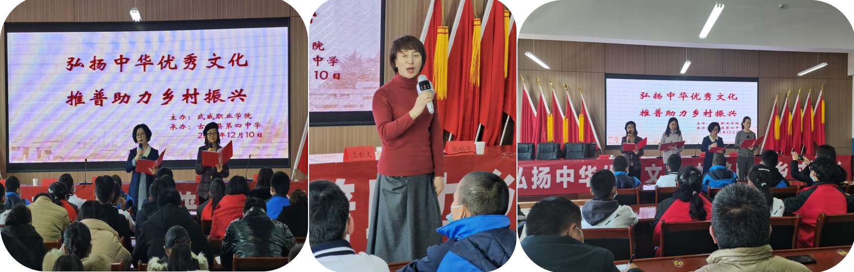 為充分發(fā)揮“甘肅省語言文字推廣基地”在服務(wù)地方經(jīng)濟社會發(fā)展、助力鄉(xiāng)村振興工作中的作用,12月10日,學(xué)院推普志愿小分隊一行7人赴古浪四中開展主題為“弘揚中華優(yōu)秀文化 推普助力鄉(xiāng)村振興”活動。