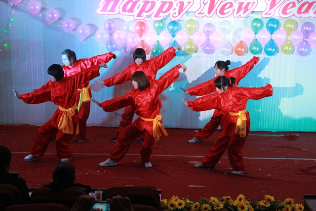我系趙磊老師的薩克斯獨奏節(jié)奏明朗,富有磁力,優(yōu)美的旋律深深地吸引了全體觀眾。12級光熱班的張新輝,張一凡等同學(xué)反串《甄嬛傳》令現(xiàn)場的觀眾捧腹大笑。一首《祝福》的朗誦牽掛了所有觀眾,武術(shù)《中國功夫》令得全場驚呼,舞蹈《江南style》的精彩演出吸引了所有人的眼球。最后晚會在《同一首歌》的大合唱中緩緩落幕。