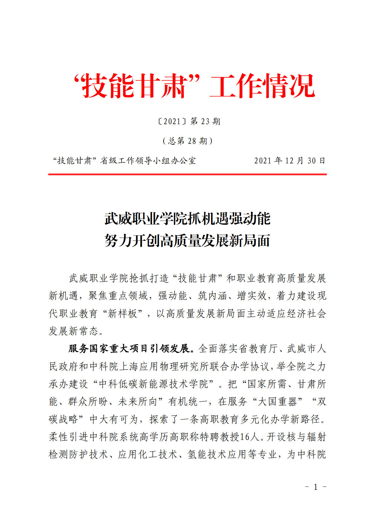 技能甘肅工作情況第28期:武威職業(yè)學(xué)院抓機(jī)遇強(qiáng)動能努力實現(xiàn)高質(zhì)量發(fā)展