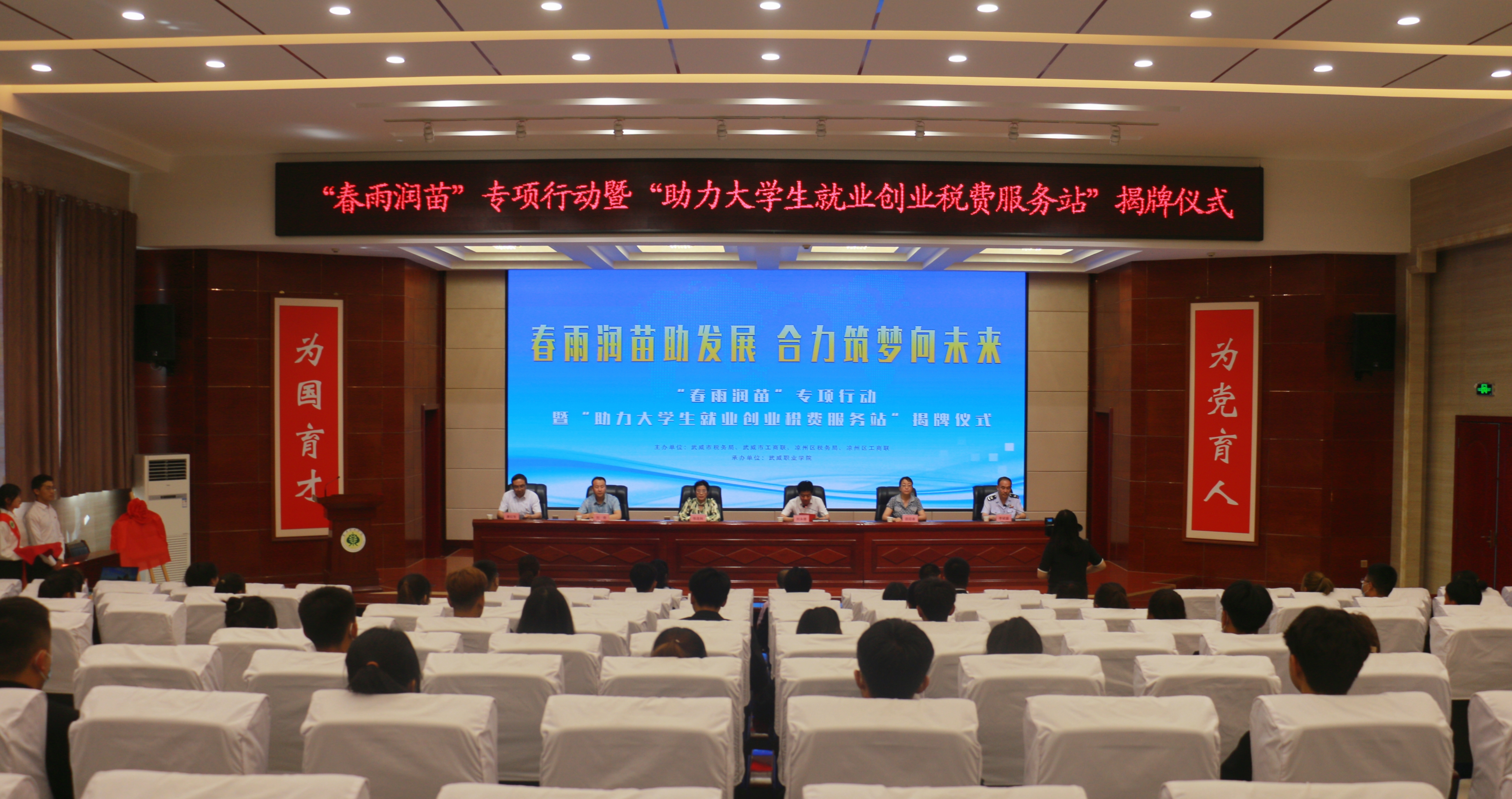 6月10日下午,武威市稅務局聯(lián)合工商聯(lián)在學校菁英廳舉辦“春雨潤苗”專項行動暨“助力大學生就業(yè)創(chuàng)業(yè)稅費服務站”揭牌儀式。武威市稅務局黨委委員、副局長劉永德,武威市工商聯(lián)副主席張連科,涼州區(qū)工商聯(lián)副主席唐紅生,學校黨委委員、副校長田迎春出席揭牌儀式,涼州區(qū)稅務局黨委委員、副局長李斌盛主持活動。武威市稅務局黨委委員、副局長劉永德在講話中指出“助力大學生就業(yè)創(chuàng)業(yè)稅費服務站”的成立,既是武威稅務部門優(yōu)化稅費服務的有力舉措,也是學院、工商聯(lián)和稅務的一次深入合作,更是三方匯聚合力,助力穩(wěn)就業(yè)、保民生、促發(fā)展的積極作為。”