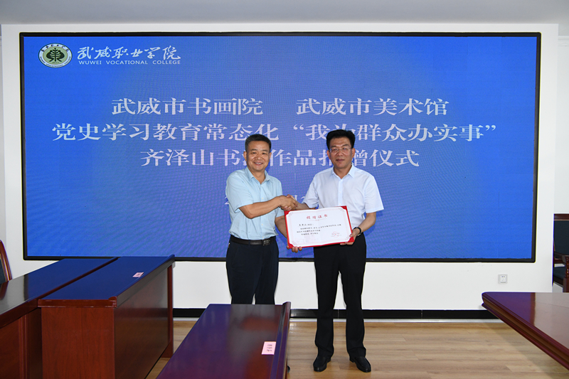 黨委書記、校長趙明向市書畫院(美術(shù)館)院長齊澤山頒發(fā)了捐贈證書,武威市書畫院(武威美術(shù)館)院長齊澤山將精心創(chuàng)作了8幅大幅書法作品捐贈給學(xué)校。