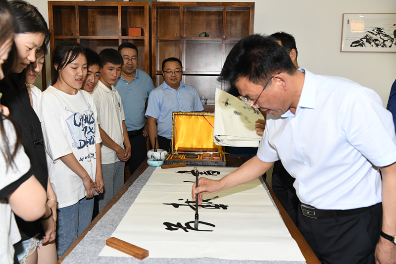 捐贈儀式前,齊澤山一行參觀了學(xué)校紅色文化藝術(shù)館、學(xué)生發(fā)展中心、雙創(chuàng)中心、藝術(shù)與教育學(xué)院書法實訓(xùn)室等場地,并現(xiàn)場指導(dǎo)學(xué)校志通書法協(xié)會學(xué)生習(xí)作。