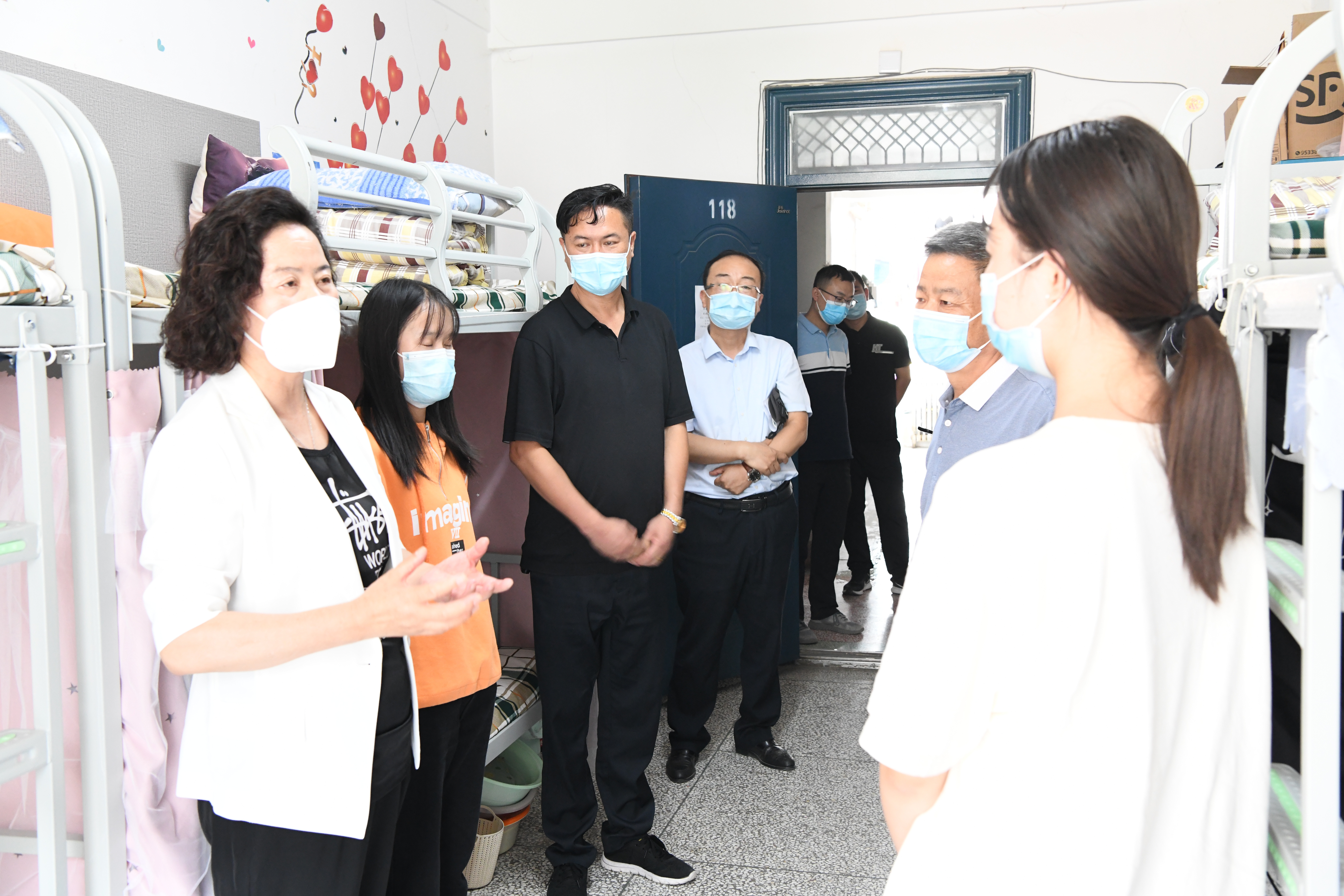 柳生墜先后來到東大門門衛(wèi)值班點、核酸檢測現(xiàn)場和學生宿舍,實地察看和了解學校門衛(wèi)管理、防控措施落實、核酸檢測、留校學生管理、餐飲保障、防疫物資儲備等情況。