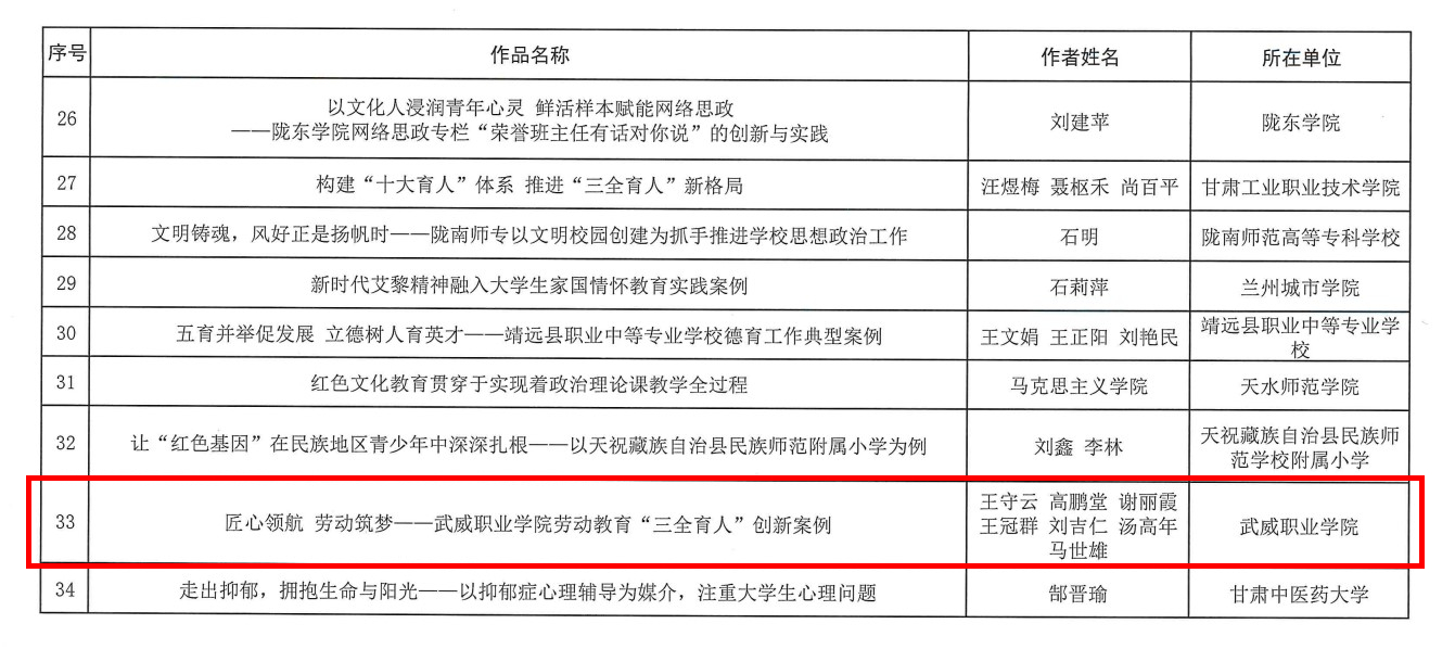 近日,2022年全省學(xué)校思想政治教育工作成果征集活動(dòng)評(píng)選結(jié)果公布,武威職業(yè)學(xué)院喜獲佳績,兩件作品獲獎(jiǎng)。其中,王守云、高鵬堂、謝麗霞、王冠群、劉吉仁、湯高年、馬世雄老師的《匠心領(lǐng)航 勞動(dòng)筑夢(mèng)—武威職業(yè)學(xué)院勞動(dòng)教育“三全育人”創(chuàng)新案例》獲思想政治典型案例三等獎(jiǎng);張保海、馮文娟、謝麗霞老師的《基于“診改”的思政教育質(zhì)量評(píng)價(jià)體系構(gòu)建研究》獲思想政治論文三等獎(jiǎng)。